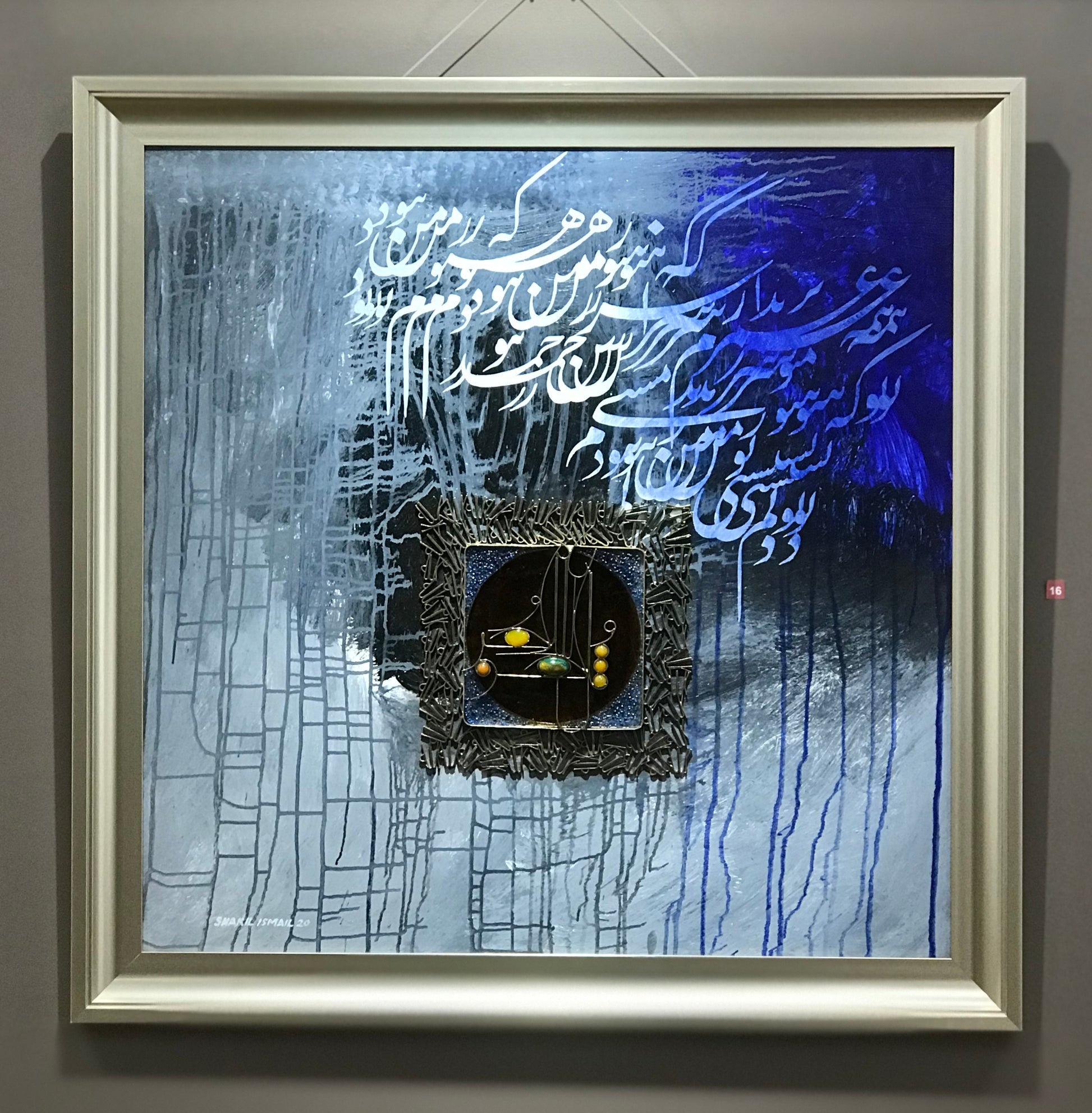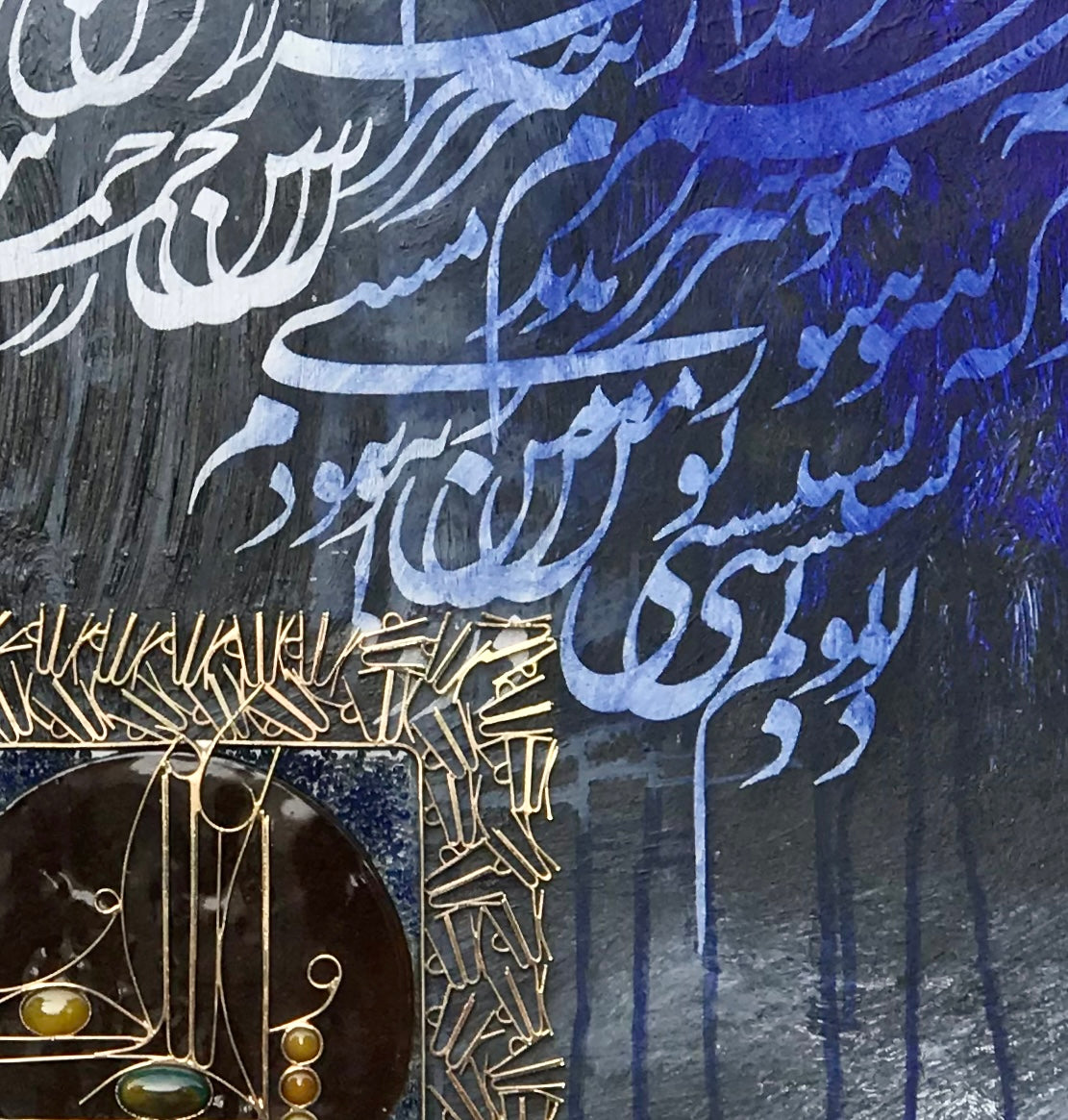 This Modern Art is a captivating dance of glass and metal. A mesmerizing square of casted glass takes center stage, cradled by a shimmering metal calligraphy of "Qul Hu Allah Hu Ahad," adorned with semi-precious stones. This radiant centerpiece is set against a backdrop of swirling blues and grays, a delicate dance of "mashq" calligraphy. The result is a modern masterpiece that celebrates unity and faith, a captivating interplay of light and devotion.
