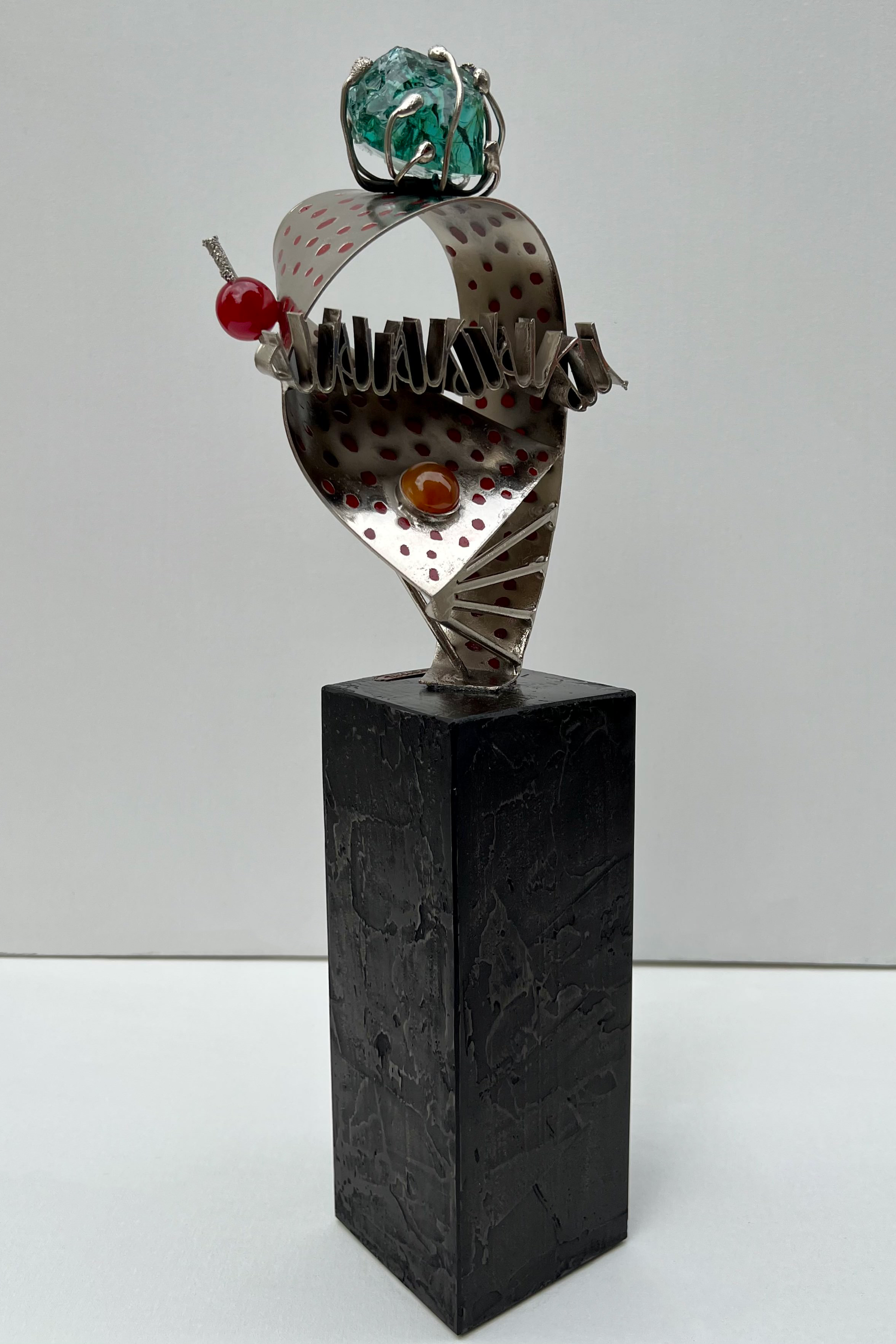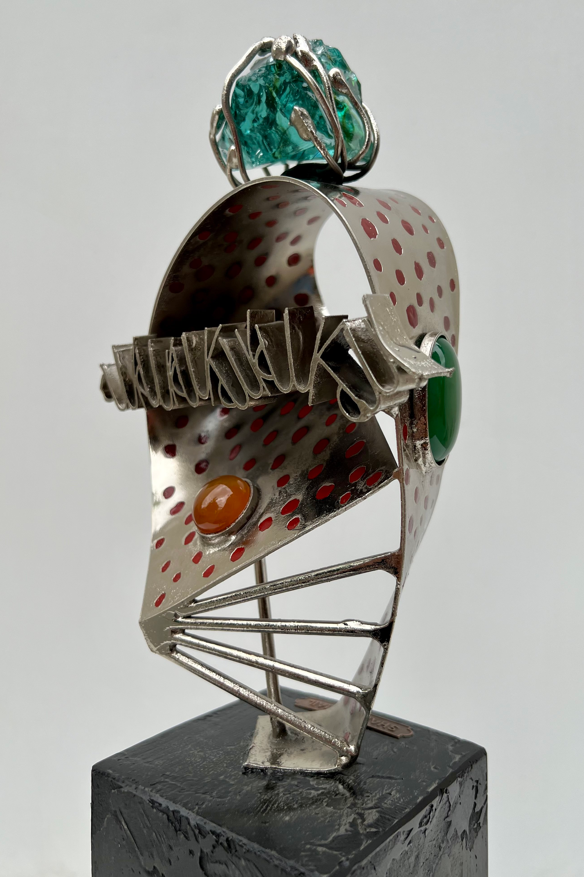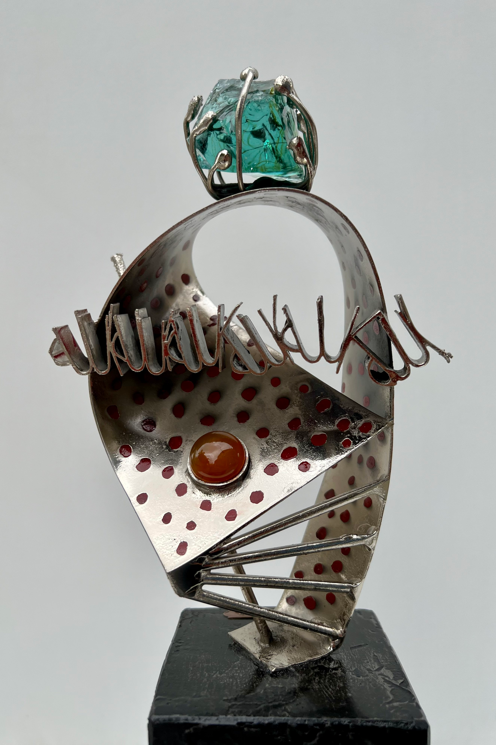 Experience the allure of refined artistry with the "Crowned by Faith" sculpture, a harmonious blend of contemporary aesthetics and timeless spirituality. Crafted with effortless precision, this abstract masterpiece captivates the senses with its modern design. At its pinnacle, a translucent green glass casting resembling a crown is embraced by metal, creating a captivating interplay of light and form.