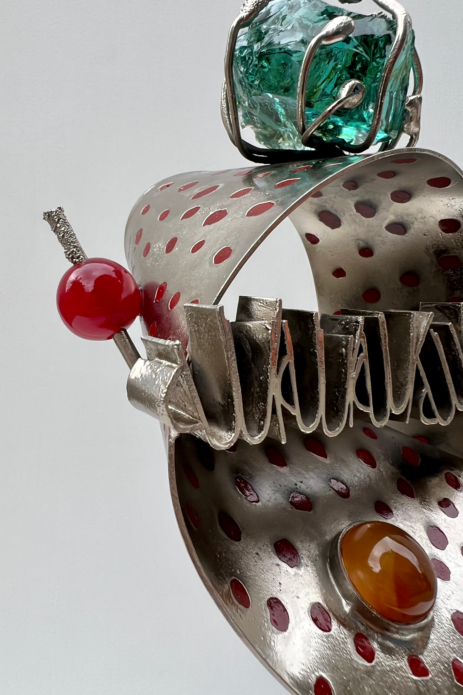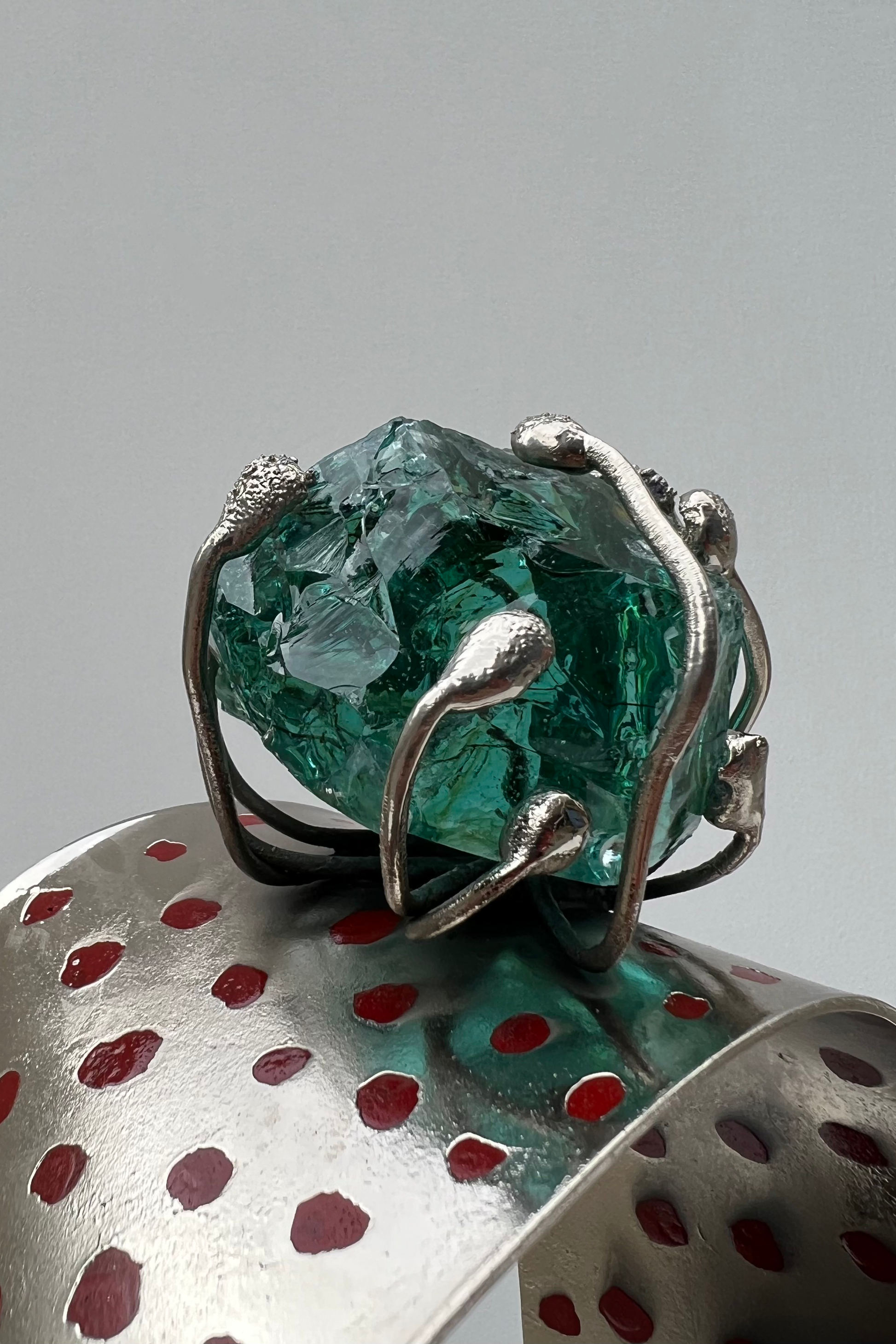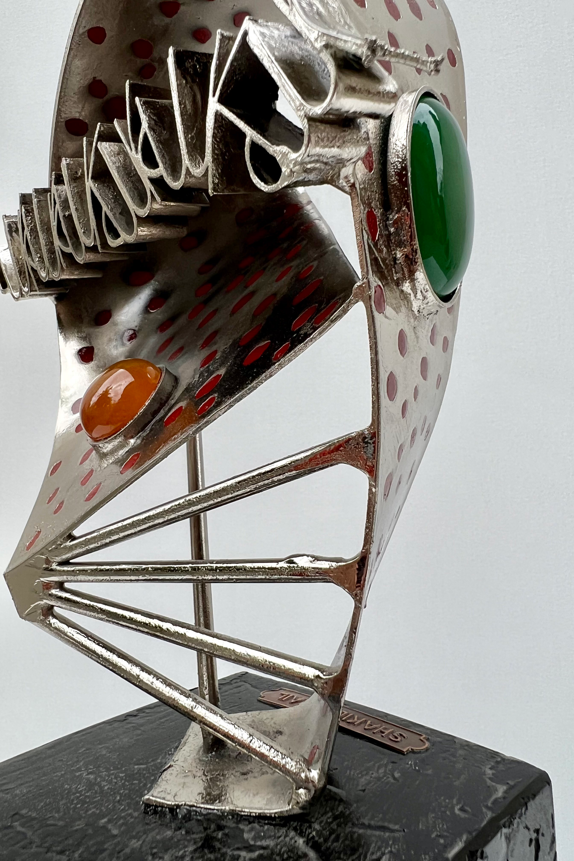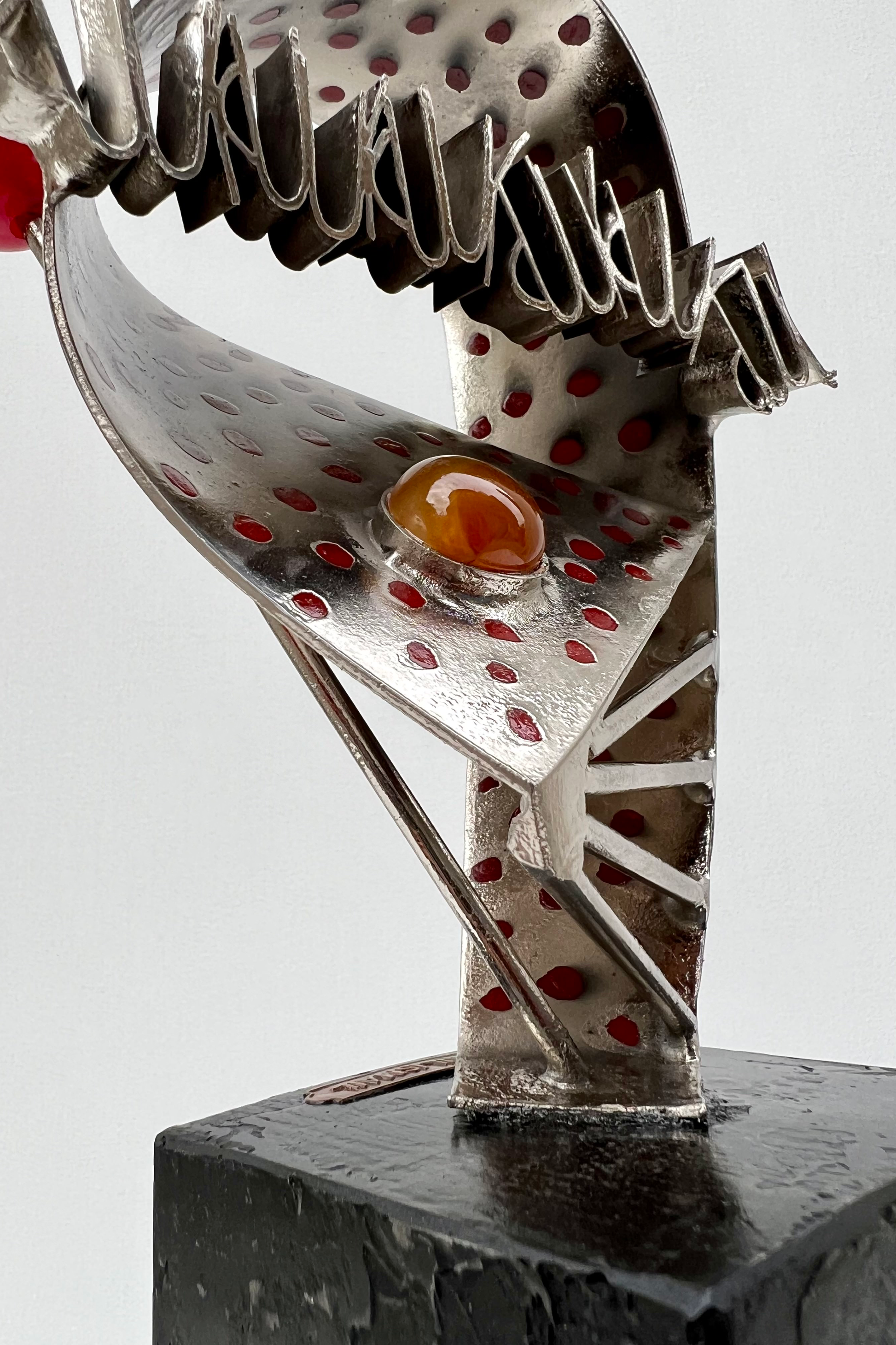 Experience the allure of refined artistry with the "Crowned by Faith" sculpture, a harmonious blend of contemporary aesthetics and timeless spirituality. Crafted with effortless precision, this abstract masterpiece captivates the senses with its modern design. At its pinnacle, a translucent green glass casting resembling a crown is embraced by metal, creating a captivating interplay of light and form.