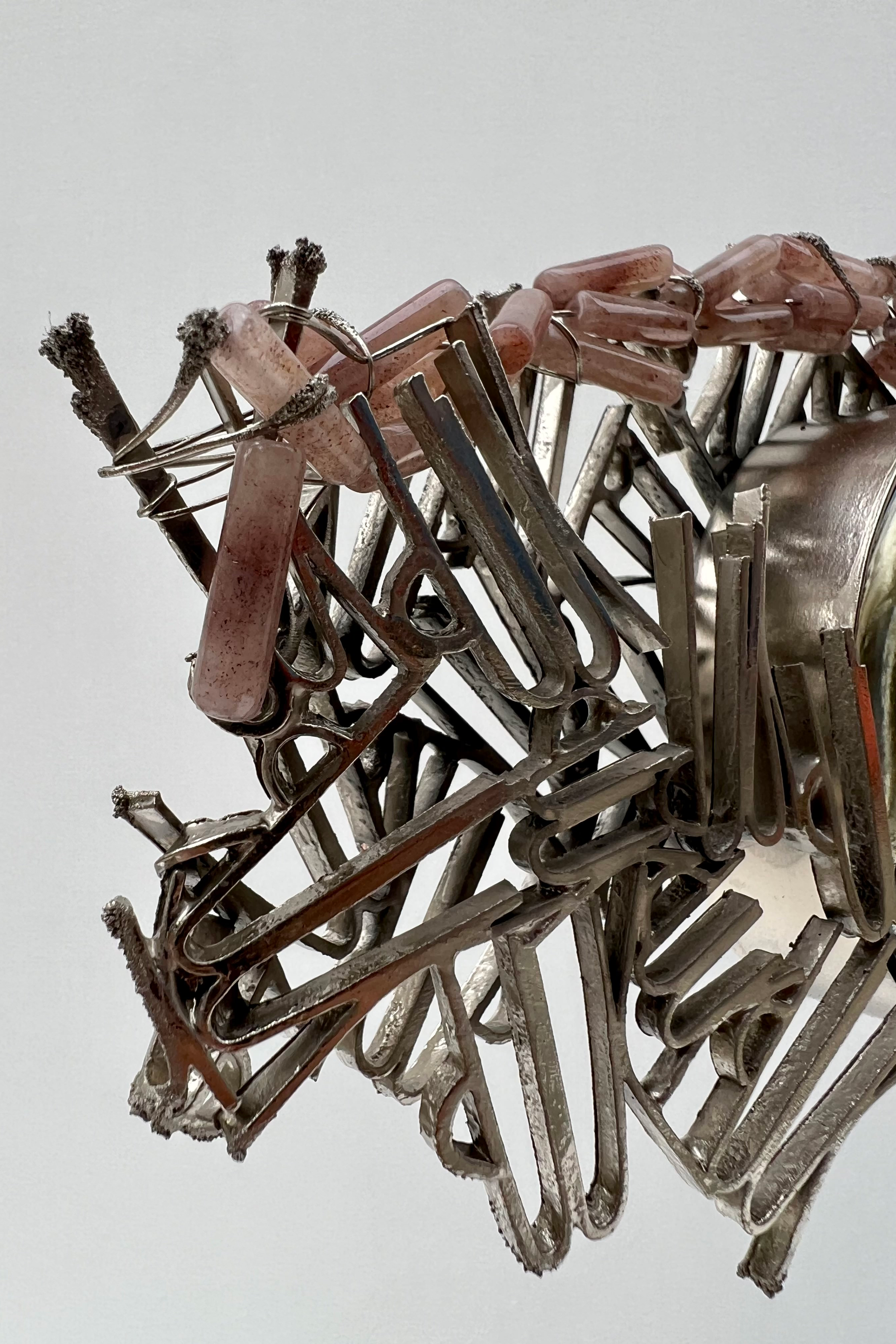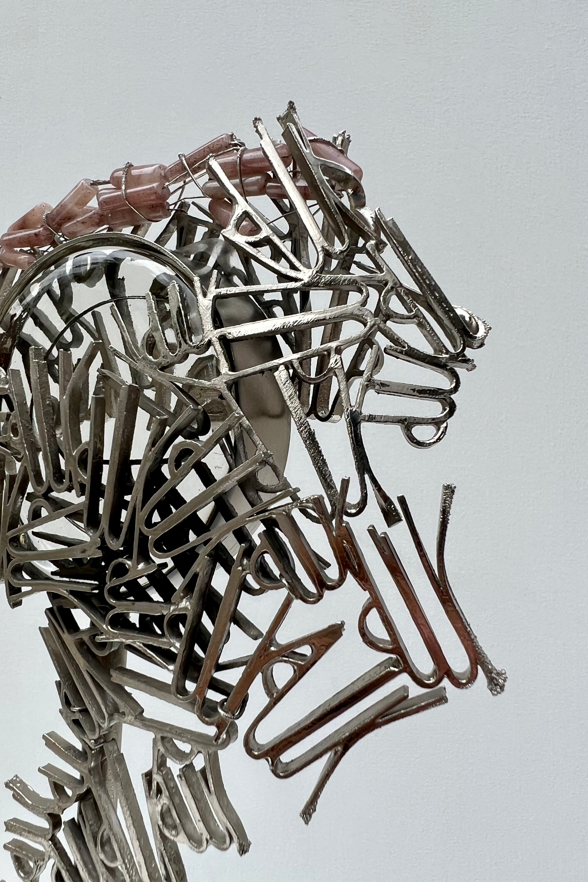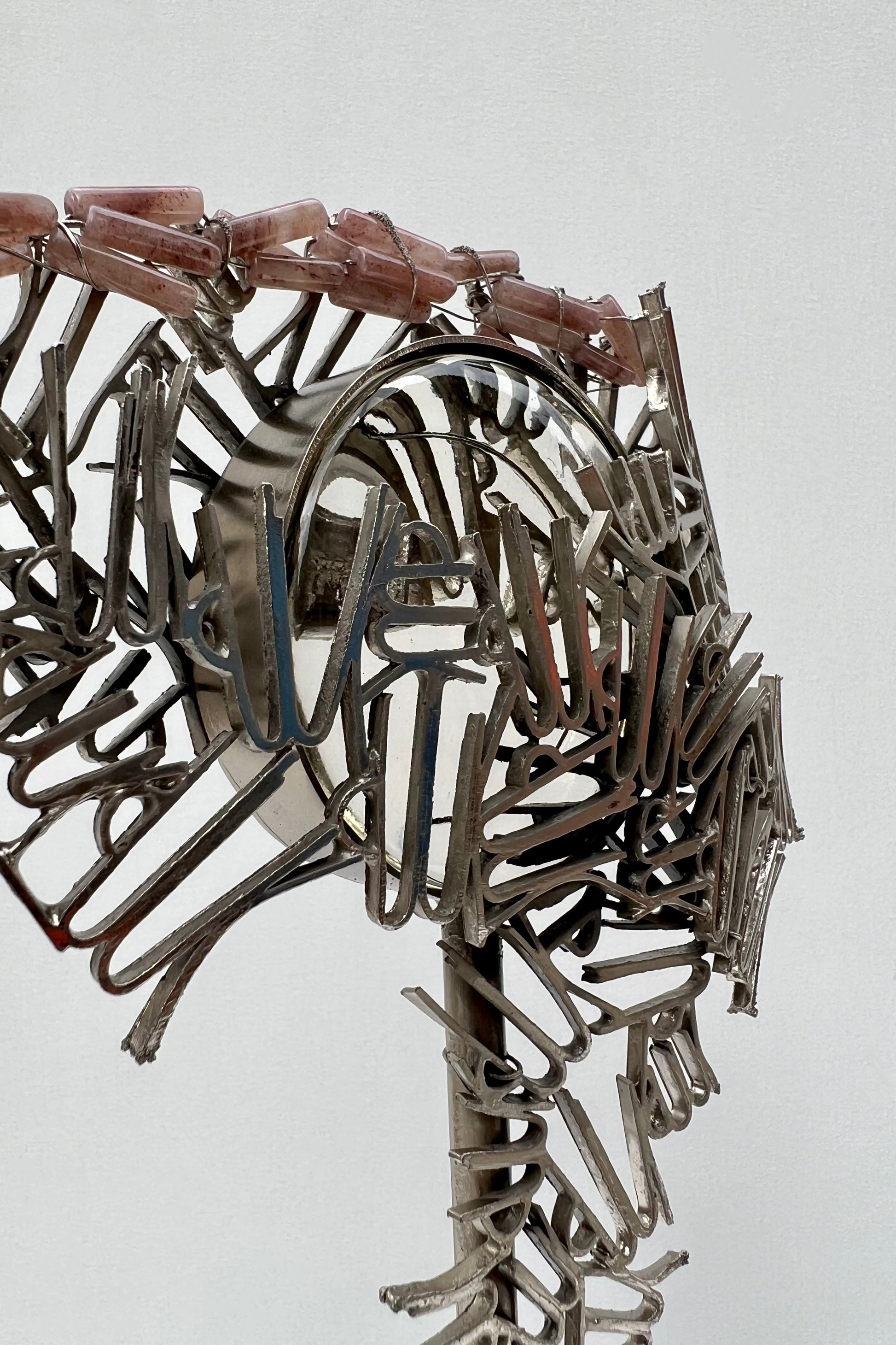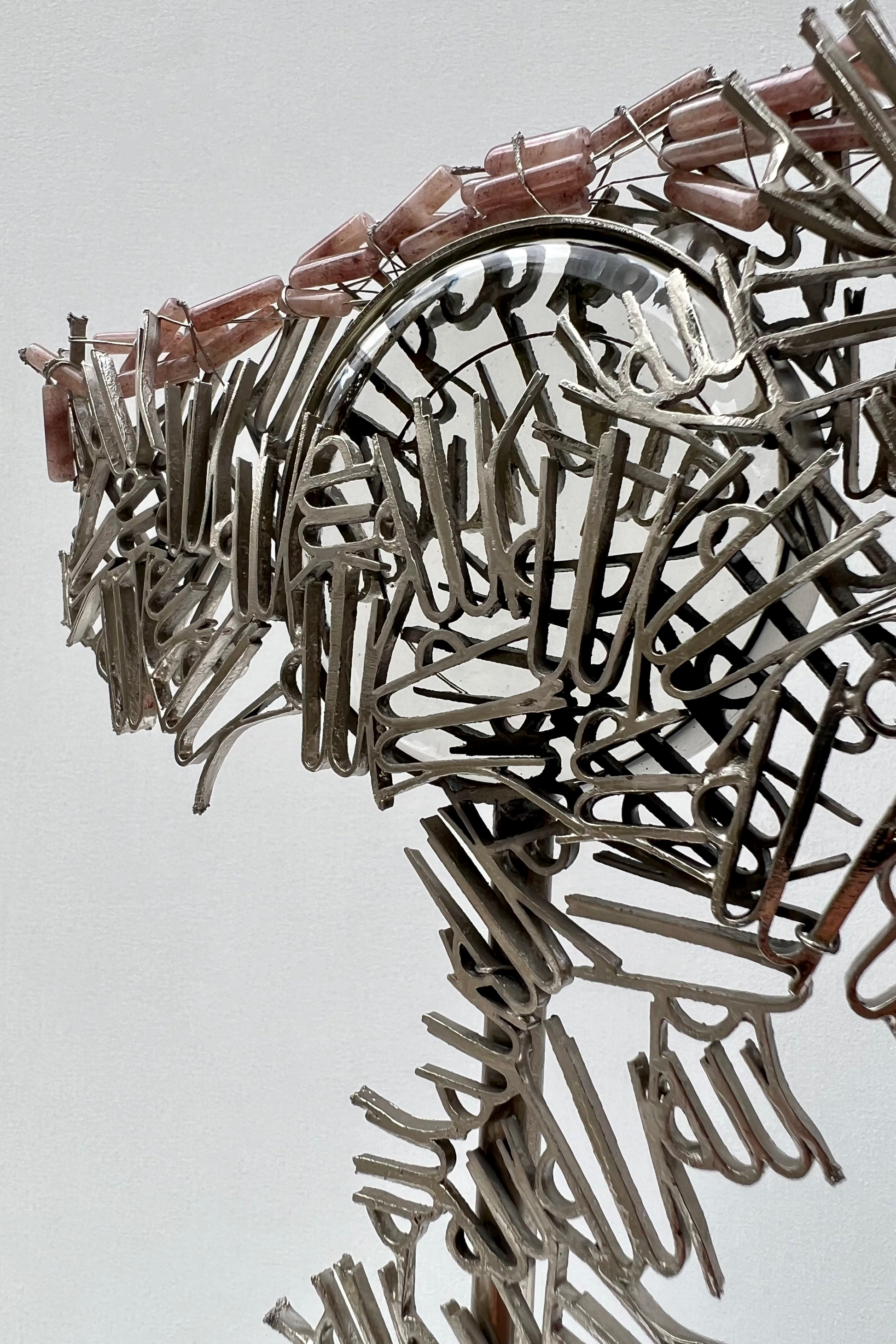 At its heart, this sculpture proudly carries the name of Allah, wrought from metal calligraphy in a manner that gracefully envelopes a central glass element. A remarkable showcase of craftsmanship, the composition of calligraphy unites seamlessly to create a captivating visual narrative. Adding an enchanting touch, semi precious agate stones adorn the sculpture's pinnacle, lending it an air of sophistication and opulence.