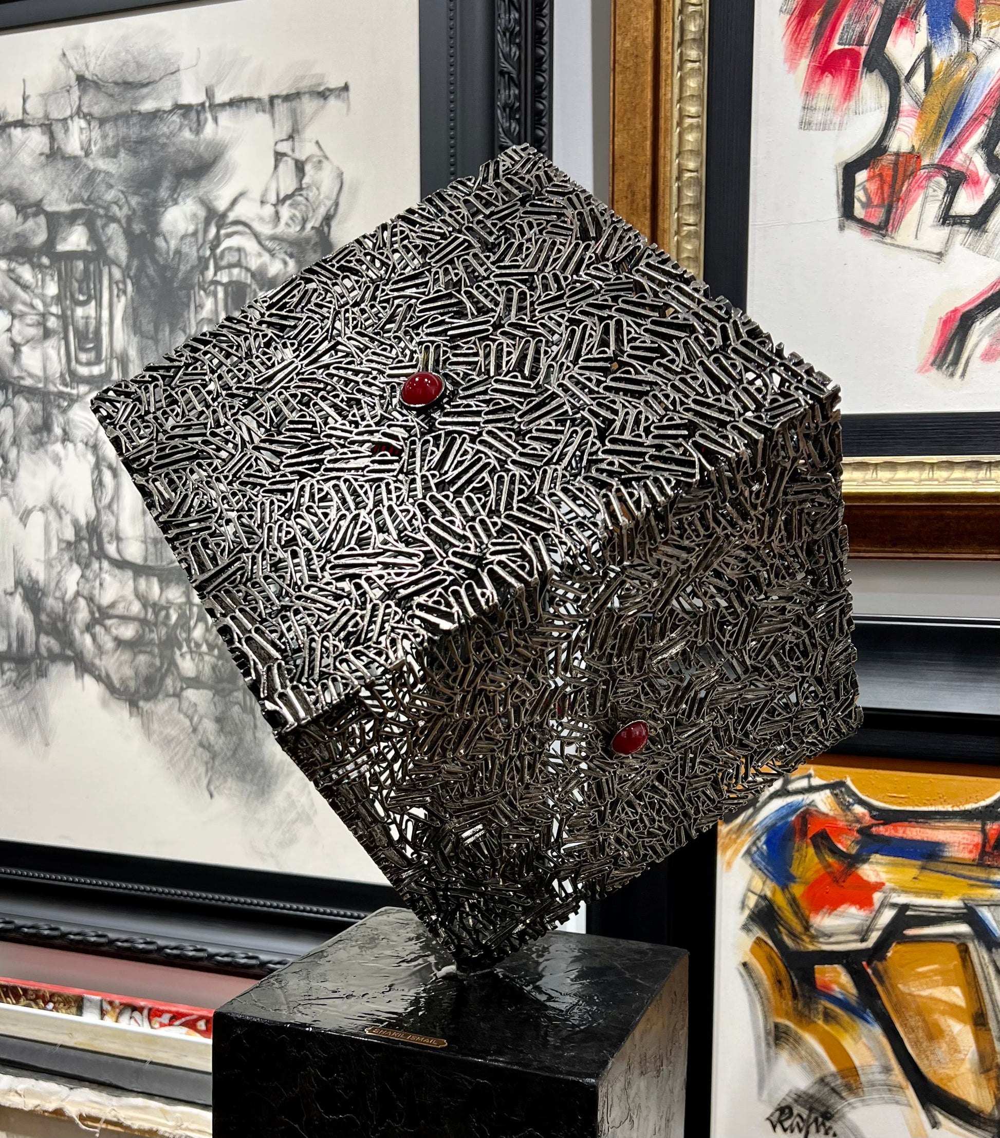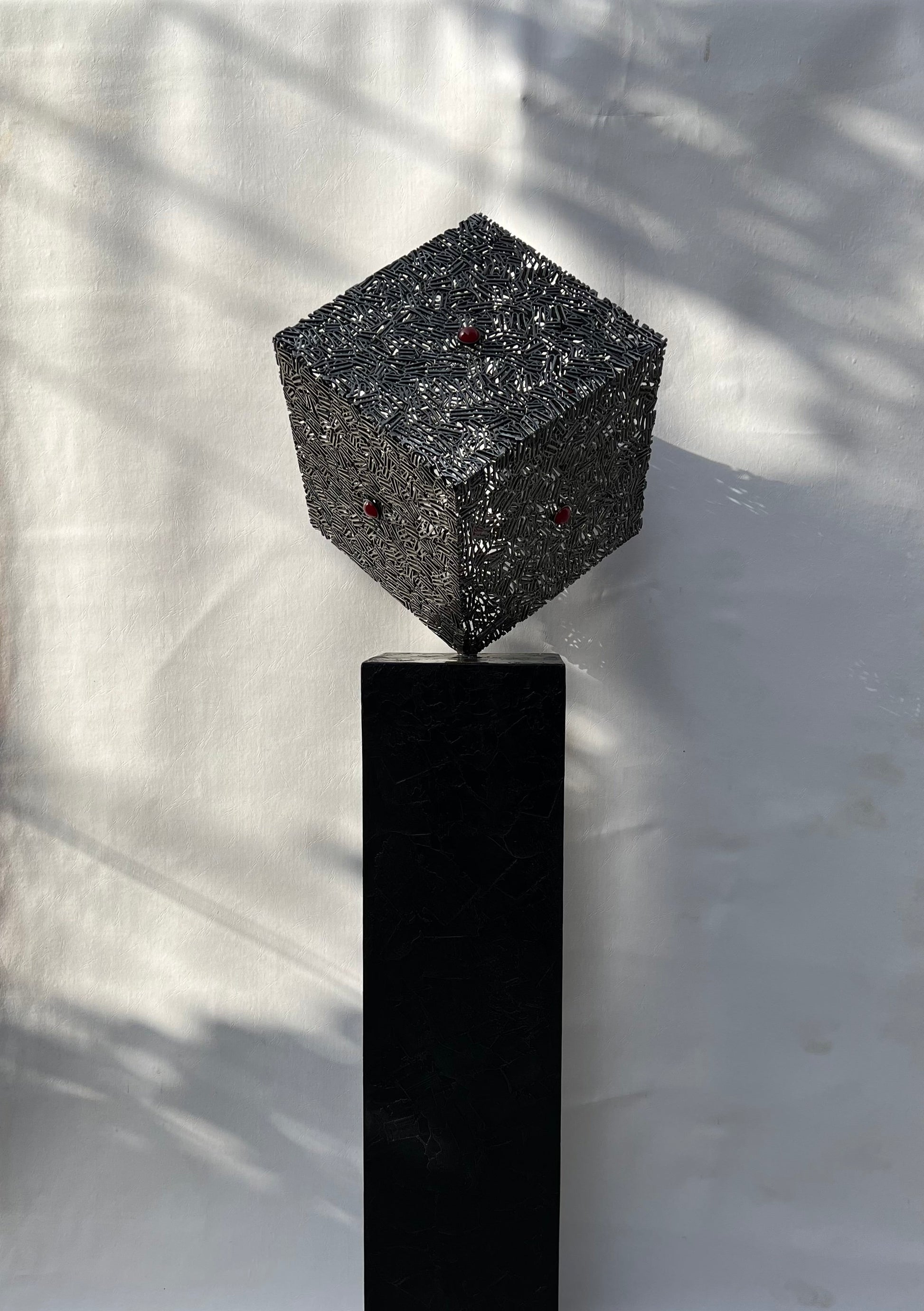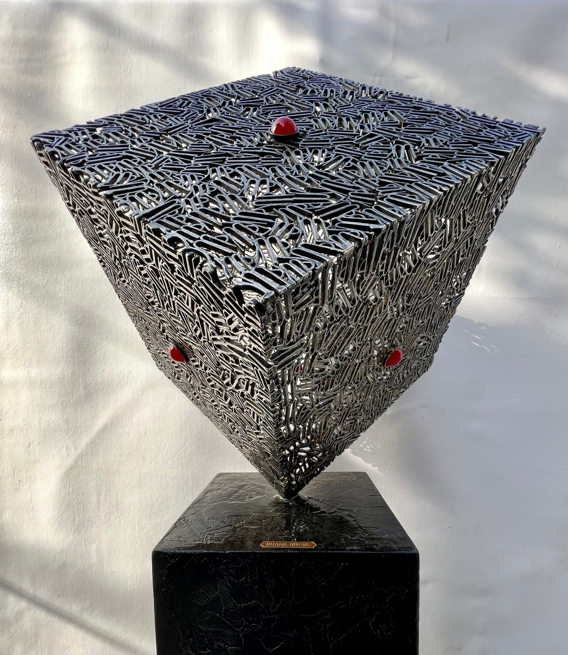 A large cube, artfully placed diagonally on a tall wooden base, captures attention with its distinctive design. The crowning glory of this sculpture lies in its sides, each adorned with the sacred calligraphy of Allah's name, meticulously shaped from metal. This timeless masterpiece boasts a remarkable array of approximately 1,200 forged divine name of Allah, engraved in varying sizes, symbolising devotion and reverence. To further enhance its allure, every side of the cube is adorned with a captivating red stone, adding a touch of sophistication to this unique artwork.