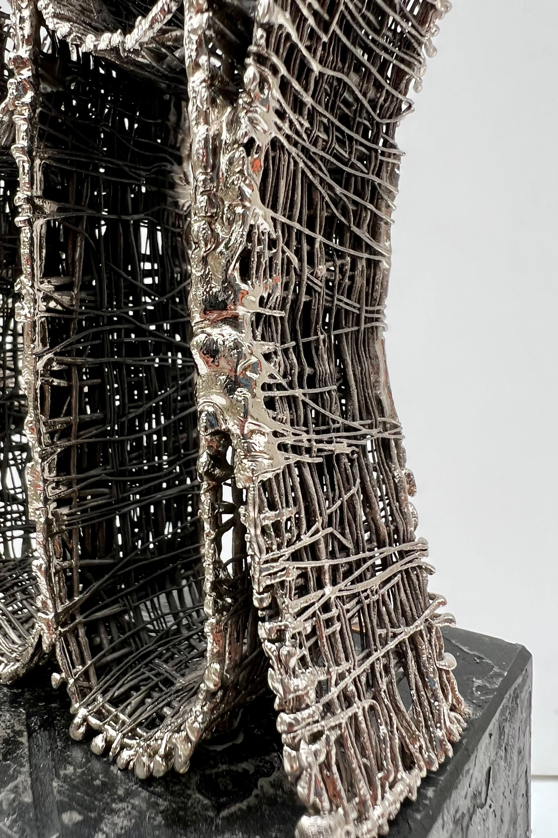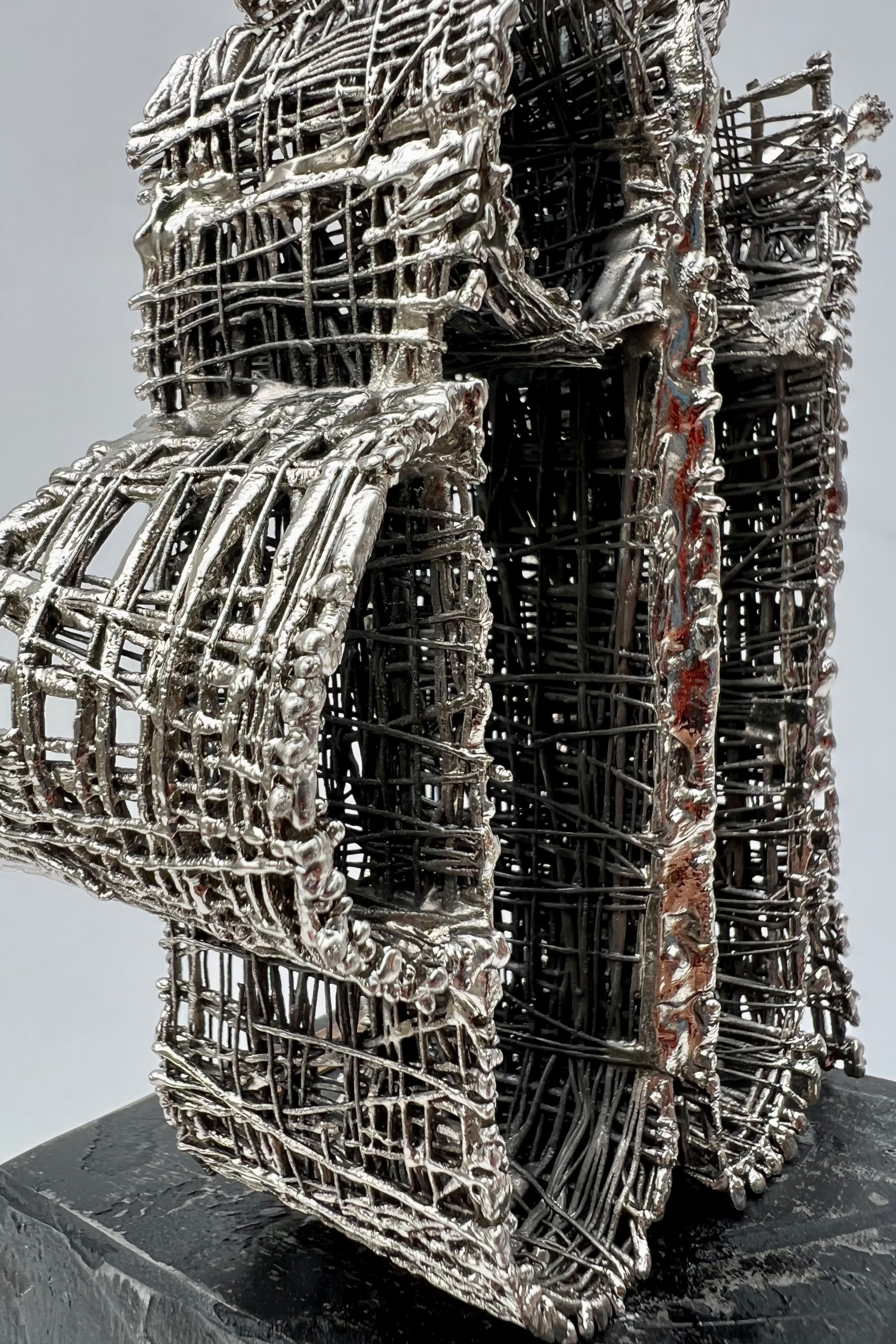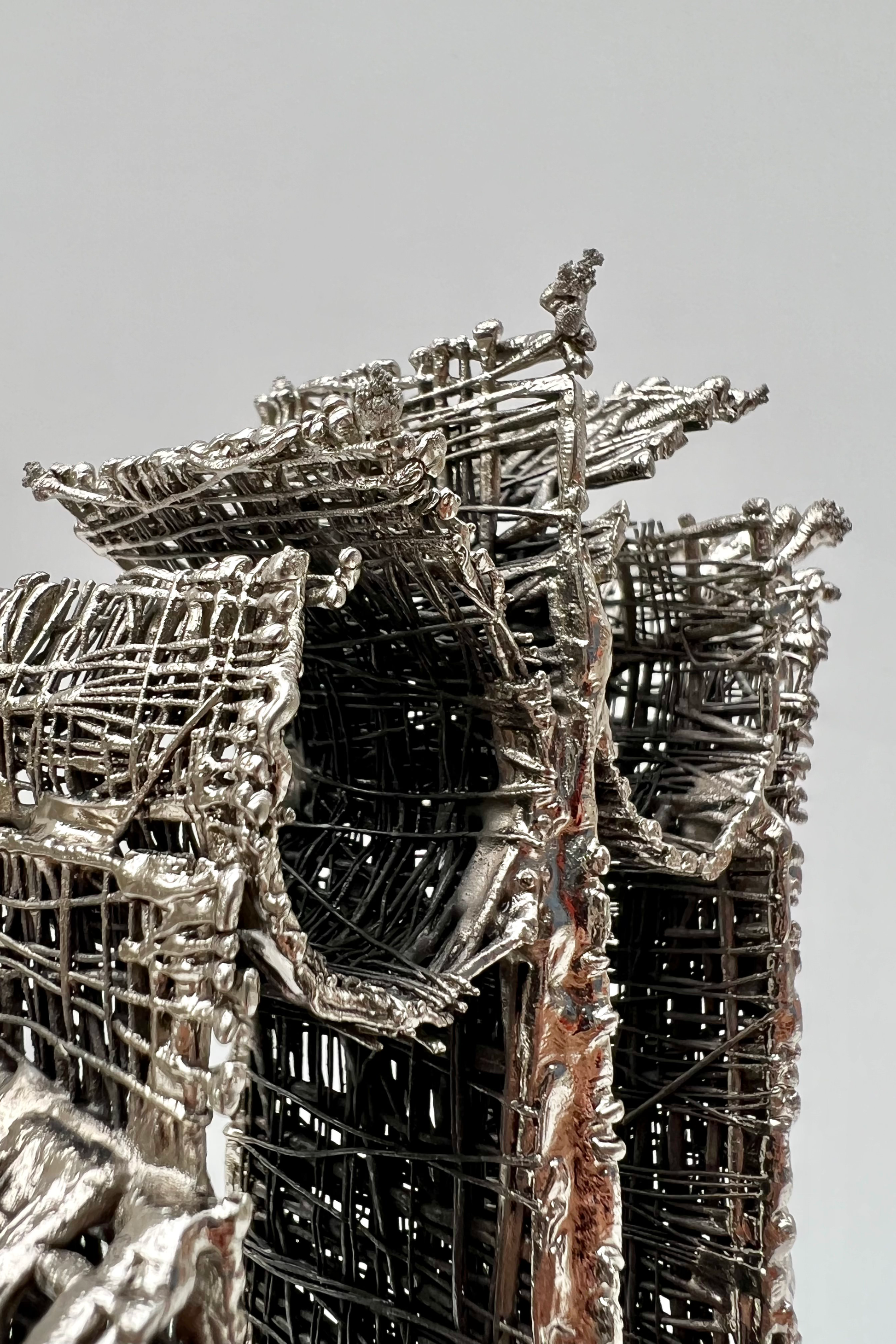 Intricately composed of delicately entwined metal wires, this sculpture intricately spells out the name "Allah," resulting in an exquisite tangle that embodies spiritual reverence. The fusion of these wires, meticulously united through the art of electroforming, evokes a sense of unity and divine interconnectedness. Set upon a wooden base, this compact yet captivating creation emanates an aura of spiritual mystique, beckoning admirers to engage with its spellbinding intricacy.