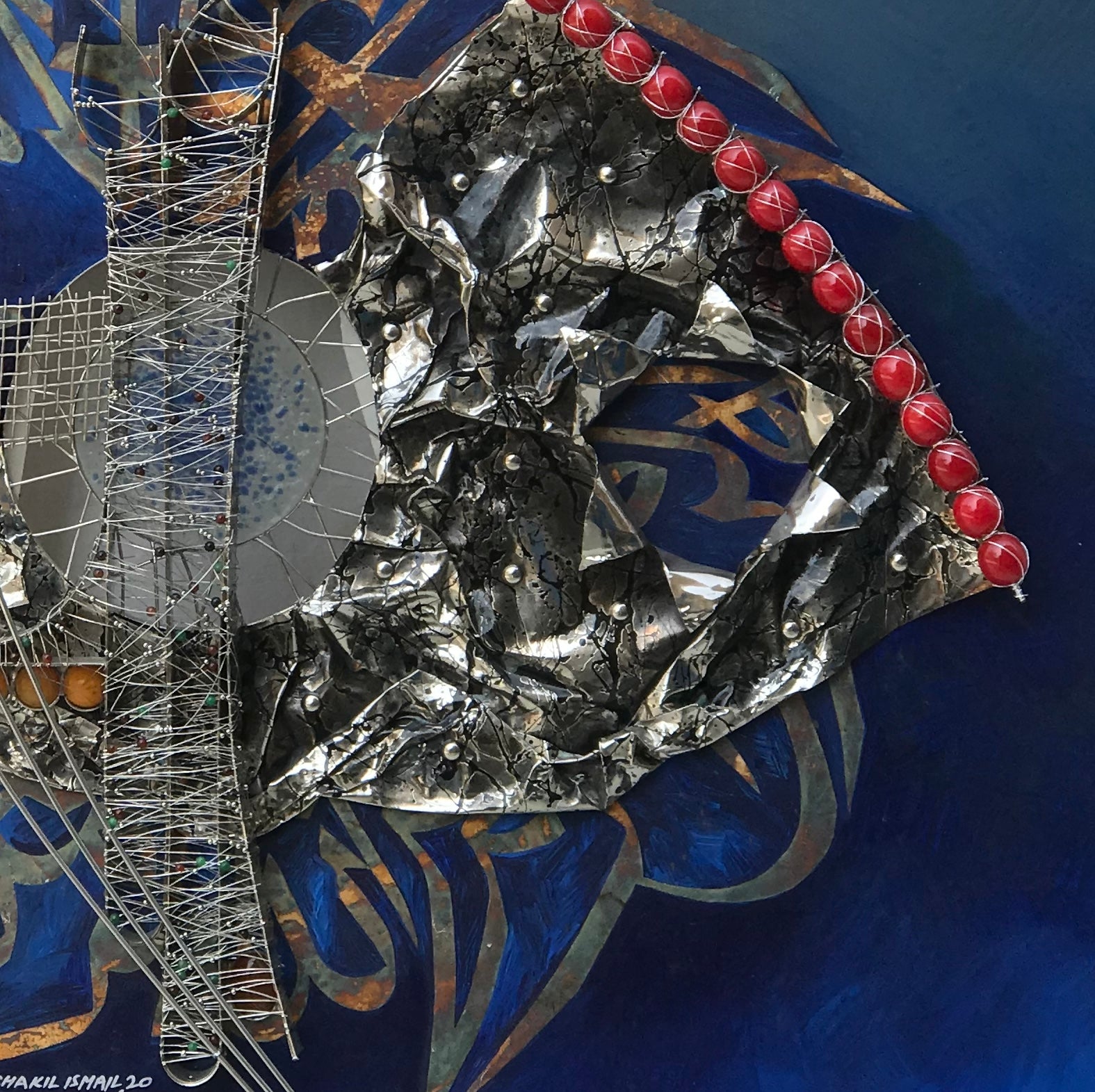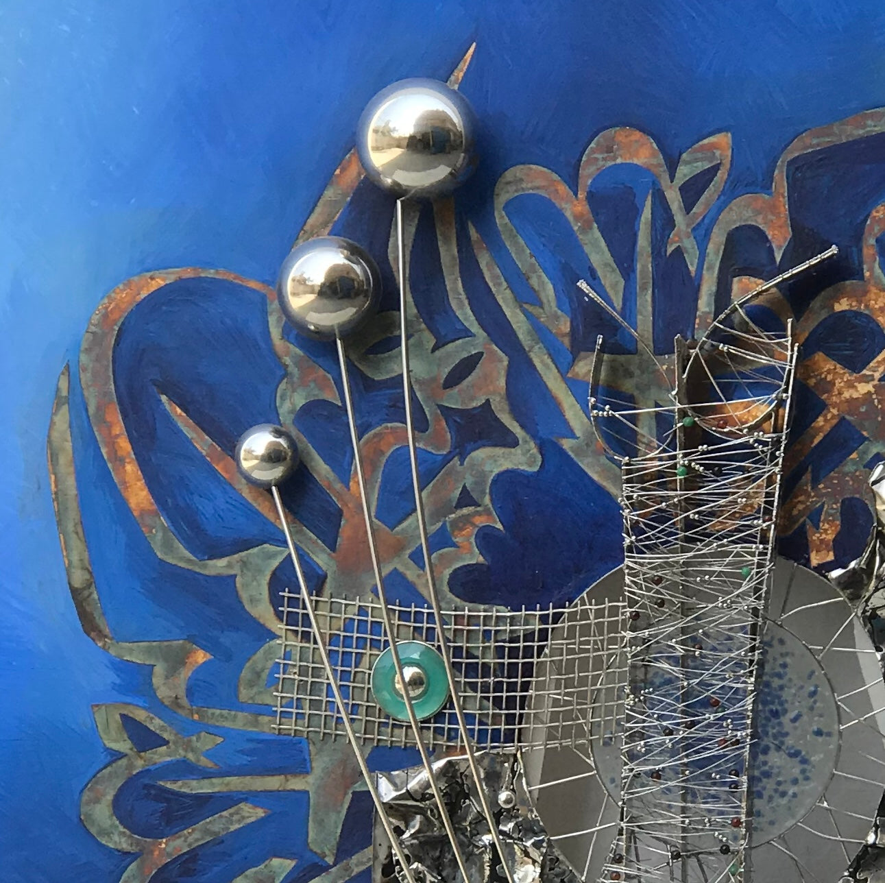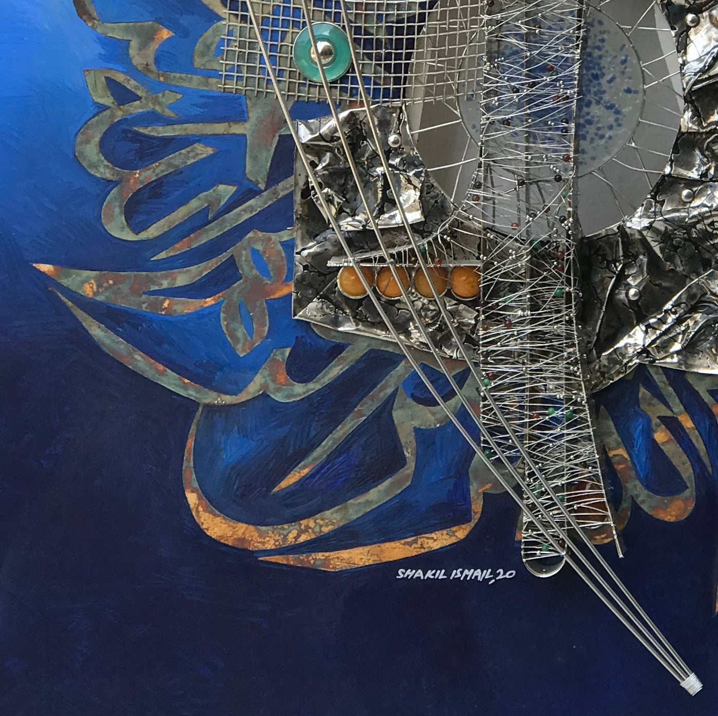 This magnificent Modern Art evokes a sense of celestial beauty. A cool blue background serves as a canvas for a captivating silver leaf circular Thuluth inscription: "Bismillah ir Rehman ir Raheem." A central circular cutout reveals a mesmerizing casted glass disc. In the foreground, a radiant metal "Allah" takes center stage, embraced by swirling metal wires. This dynamic centerpiece is further adorned with an intricate metal composition embellished with semi-precious stones. This Artwork is a modern masterpiece that celebrates the power and beauty of faith, a testament to the divine light that illuminates the artistic spirit.
