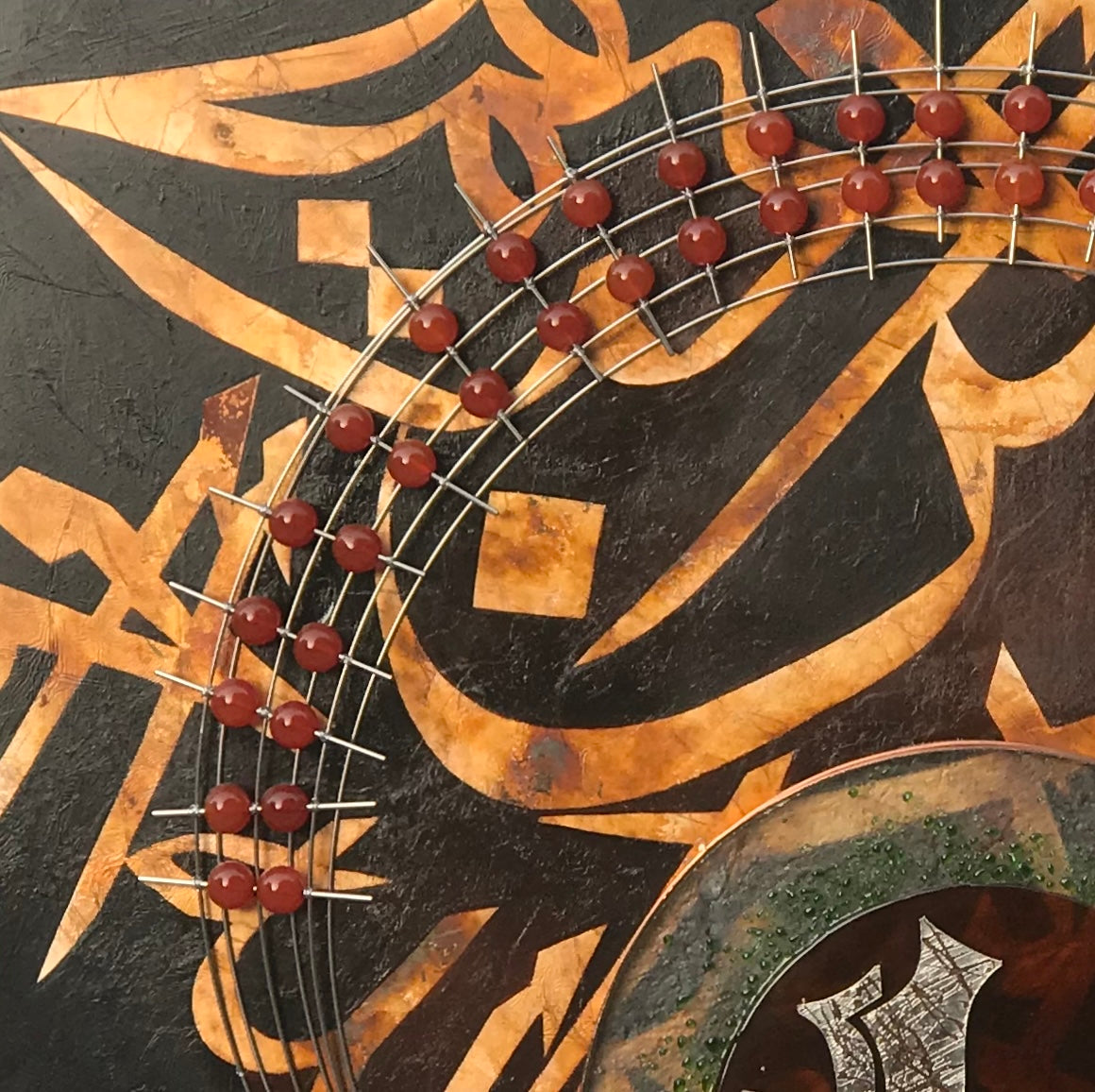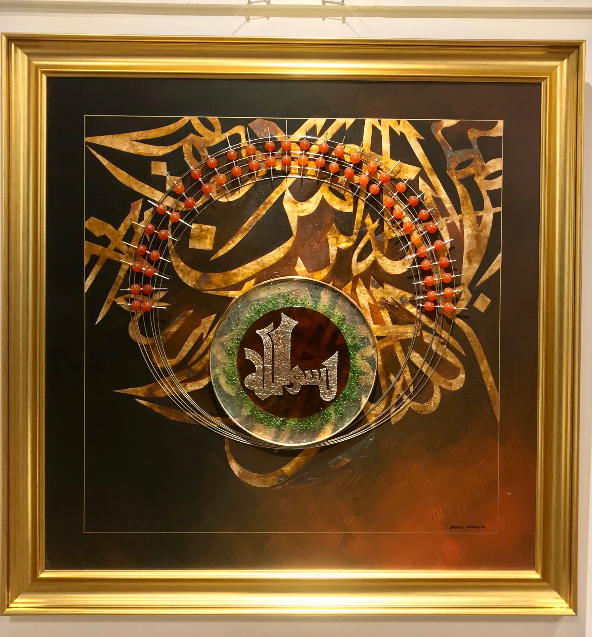 This Modern Art evokes a sense of grounded reverence. Rich tones of brown and umber bathe the artwork, creating a warm and inviting atmosphere. The background whispers a prayer with elegant silver leaf Thuluth calligraphy: "Bismillah ir Rehman ir Rahim." The centerpiece takes center stage - a captivating casted glass adorned with a "Bismillah" inscription in decorative Kufic script, rendered in gleaming metal. Swirling metal wires, embellished with semi-precious stones, dance around the glass, adding a touch of movement and light. This modern masterpiece is a powerful invocation, a warm welcome for the viewer.