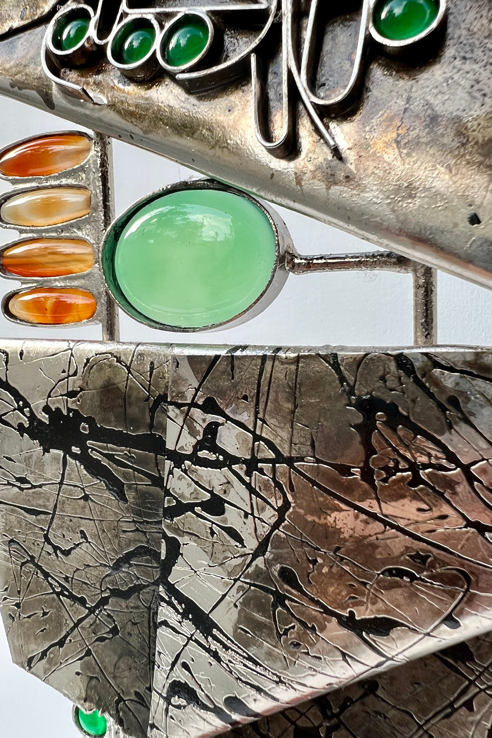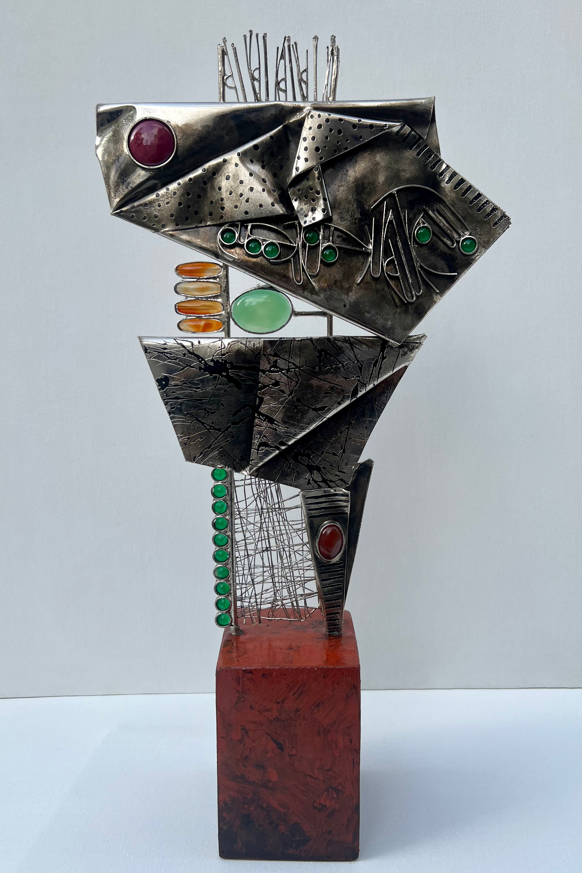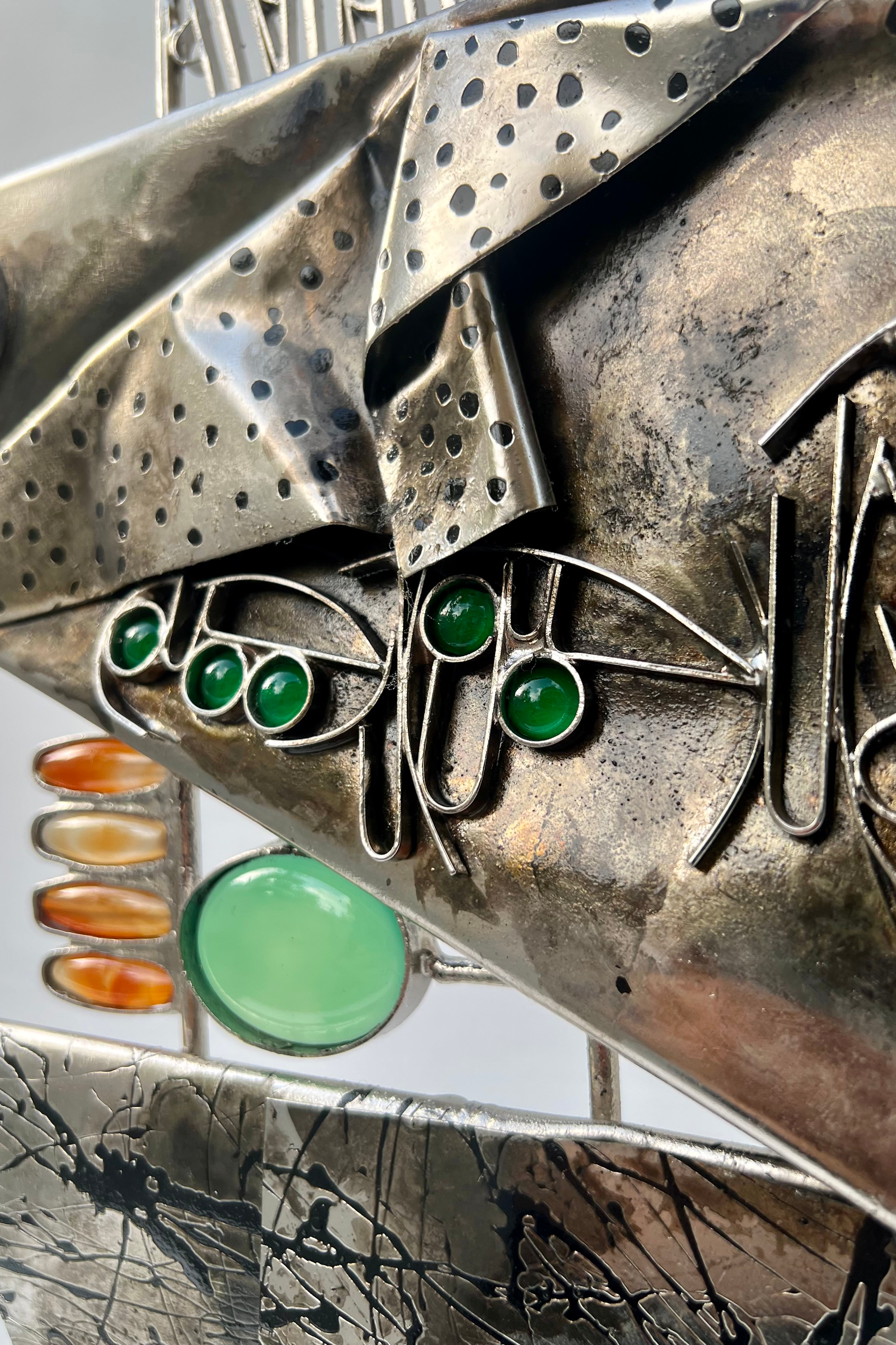 At the heart of this sculpture, the captivating metal calligraphy of Bismillahir Rahmanir Raheem holds a profound presence. Complemented by a selection of semiprecious agate and jade stones, this sculpture comes alive with intricate details and visual richness. The interplay of these stones adds depth and dimension, while the subtle black texture highlights the sculpture's dynamic features. Resting gracefully on a wooden base, this masterpiece brings the elegance of Islamic art to life in your space.