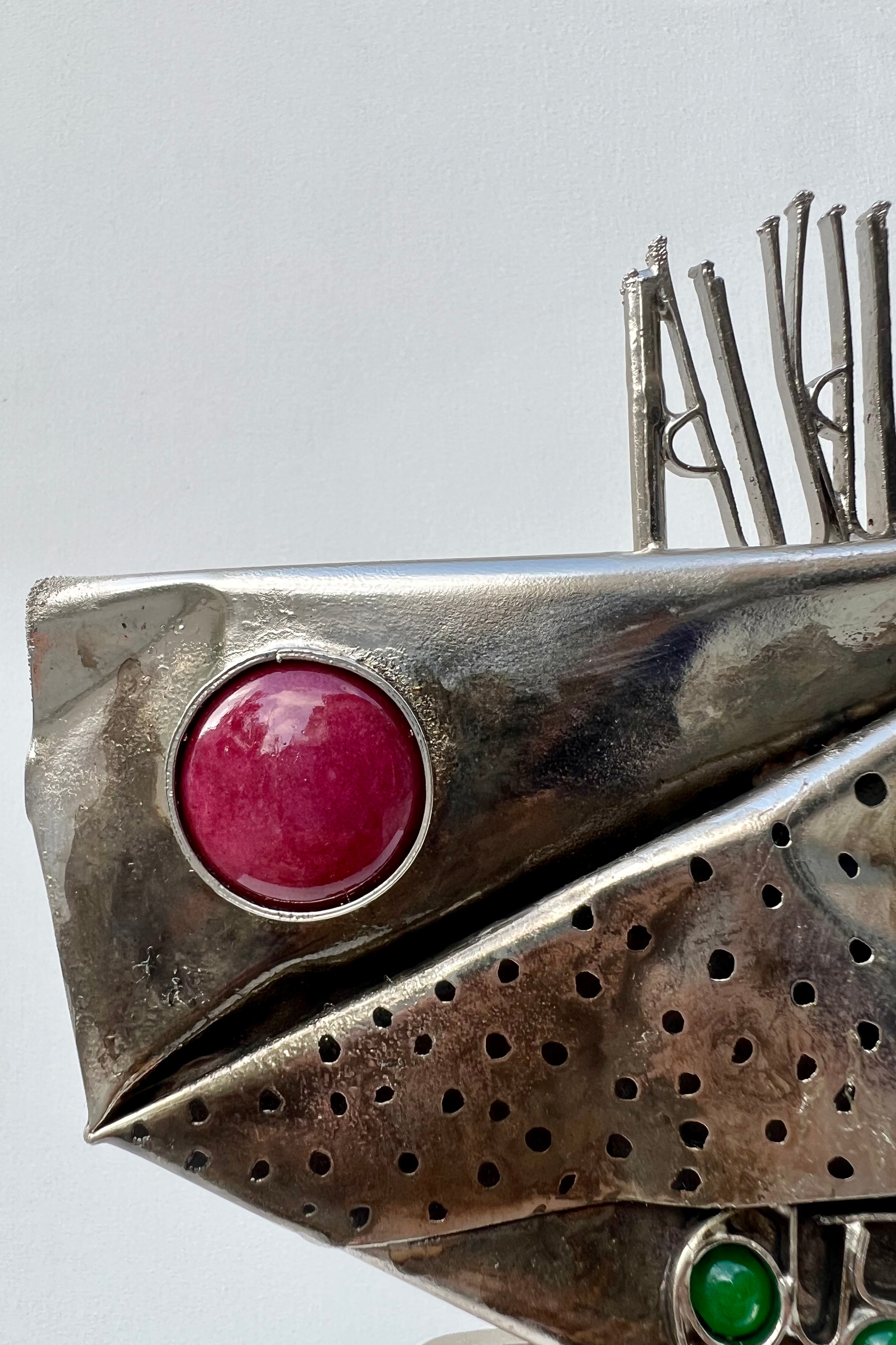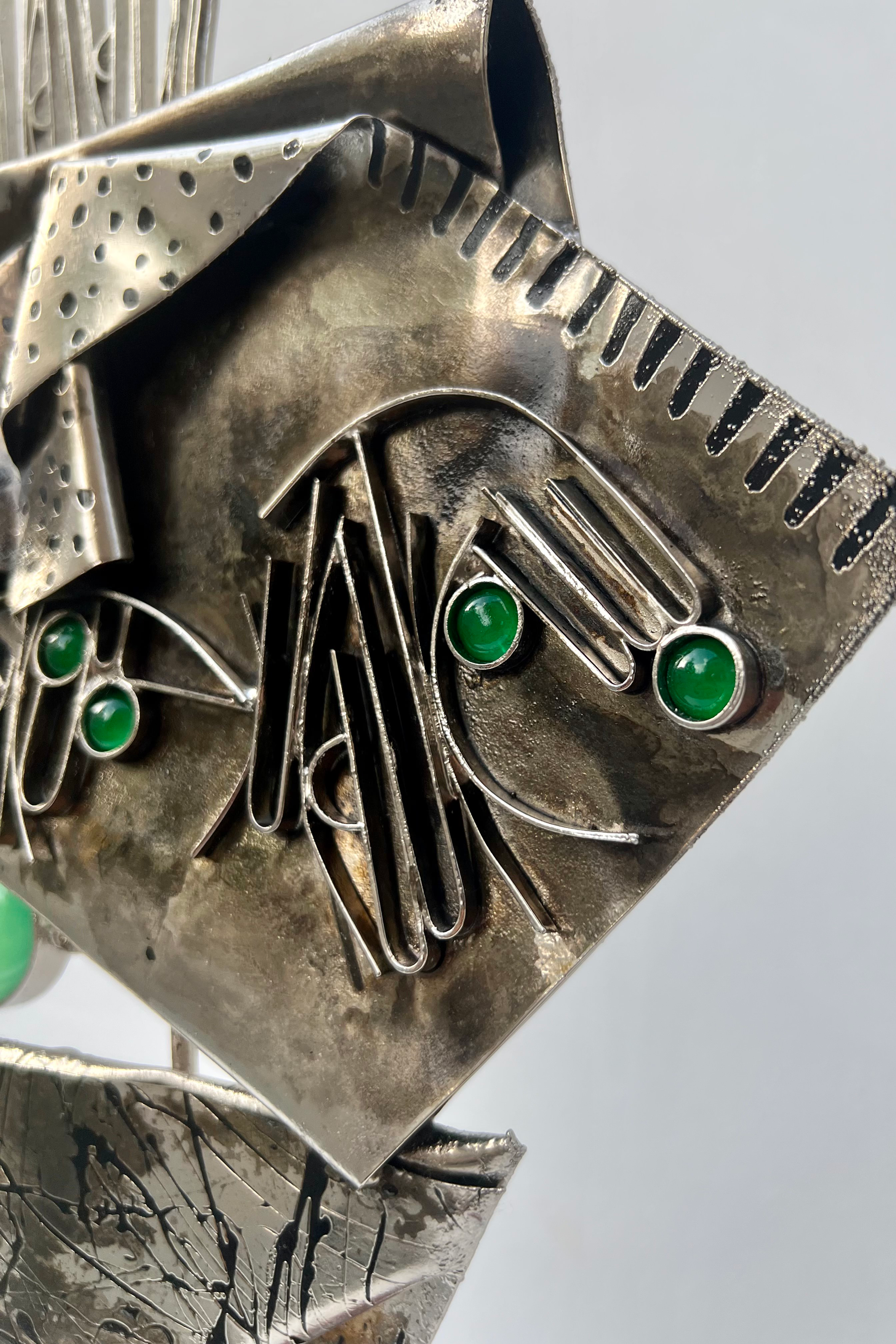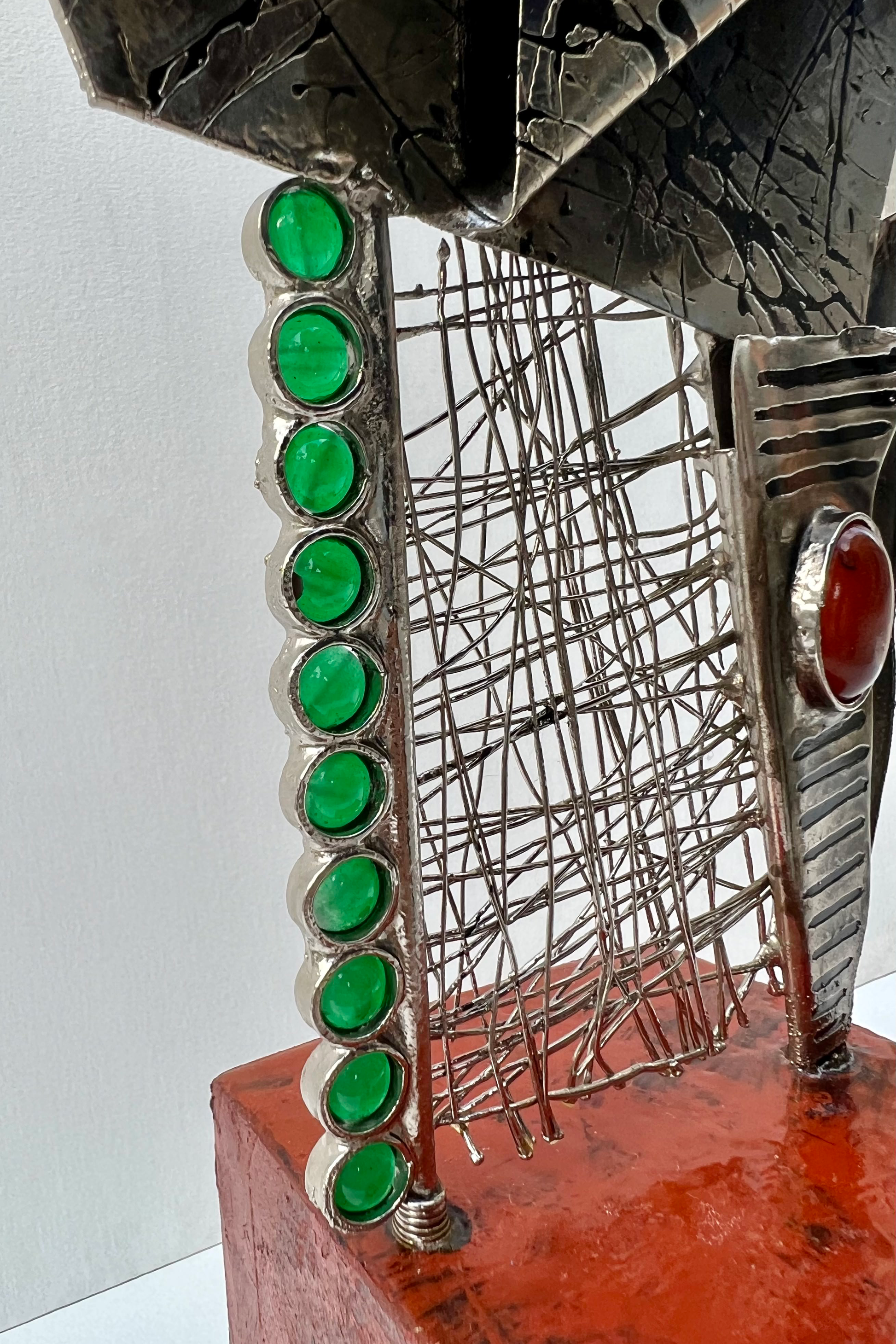 At the heart of this sculpture, the captivating metal calligraphy of Bismillahir Rahmanir Raheem holds a profound presence. Complemented by a selection of semiprecious agate and jade stones, this sculpture comes alive with intricate details and visual richness. The interplay of these stones adds depth and dimension, while the subtle black texture highlights the sculpture's dynamic features. Resting gracefully on a wooden base, this masterpiece brings the elegance of Islamic art to life in your space.