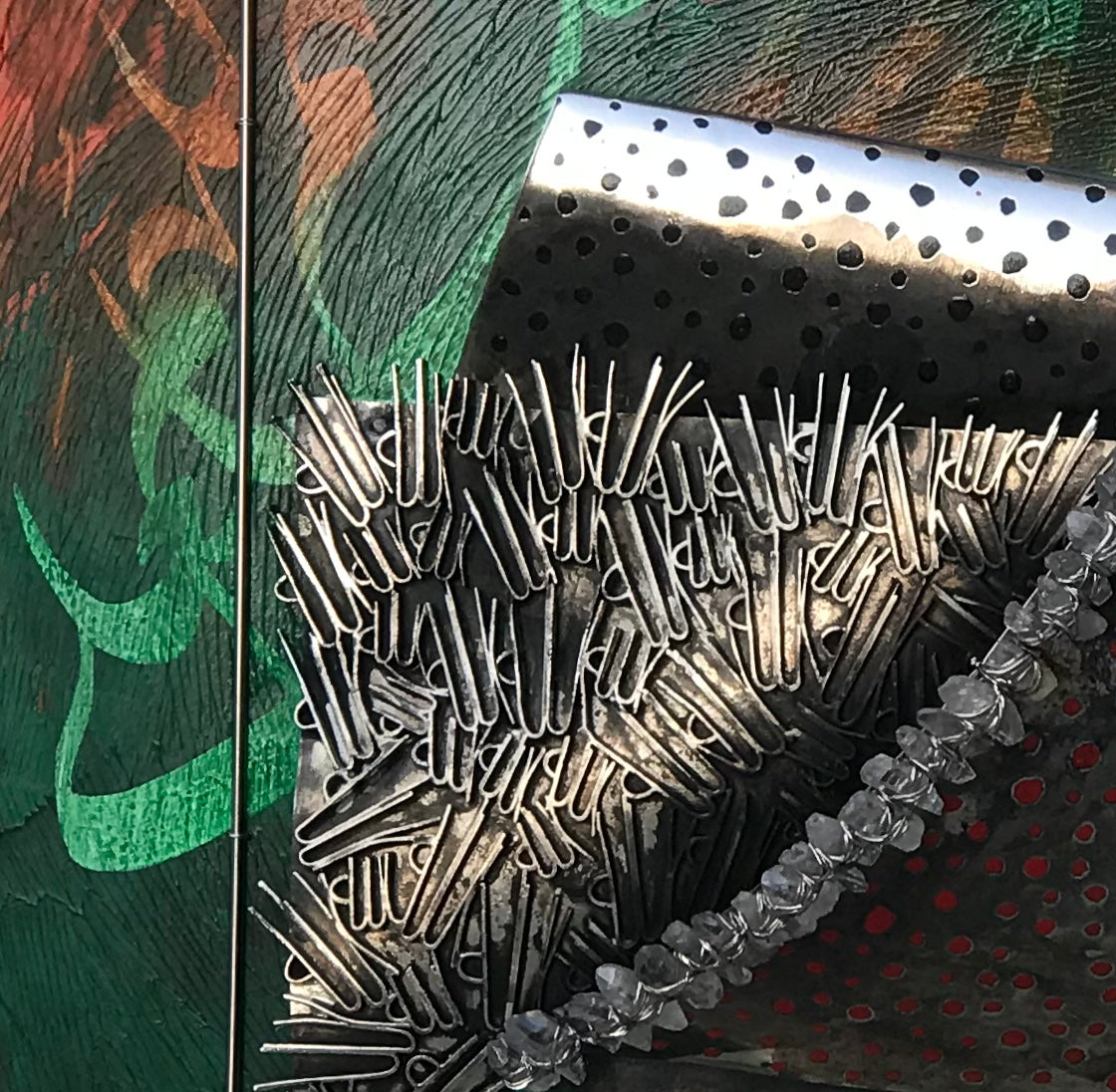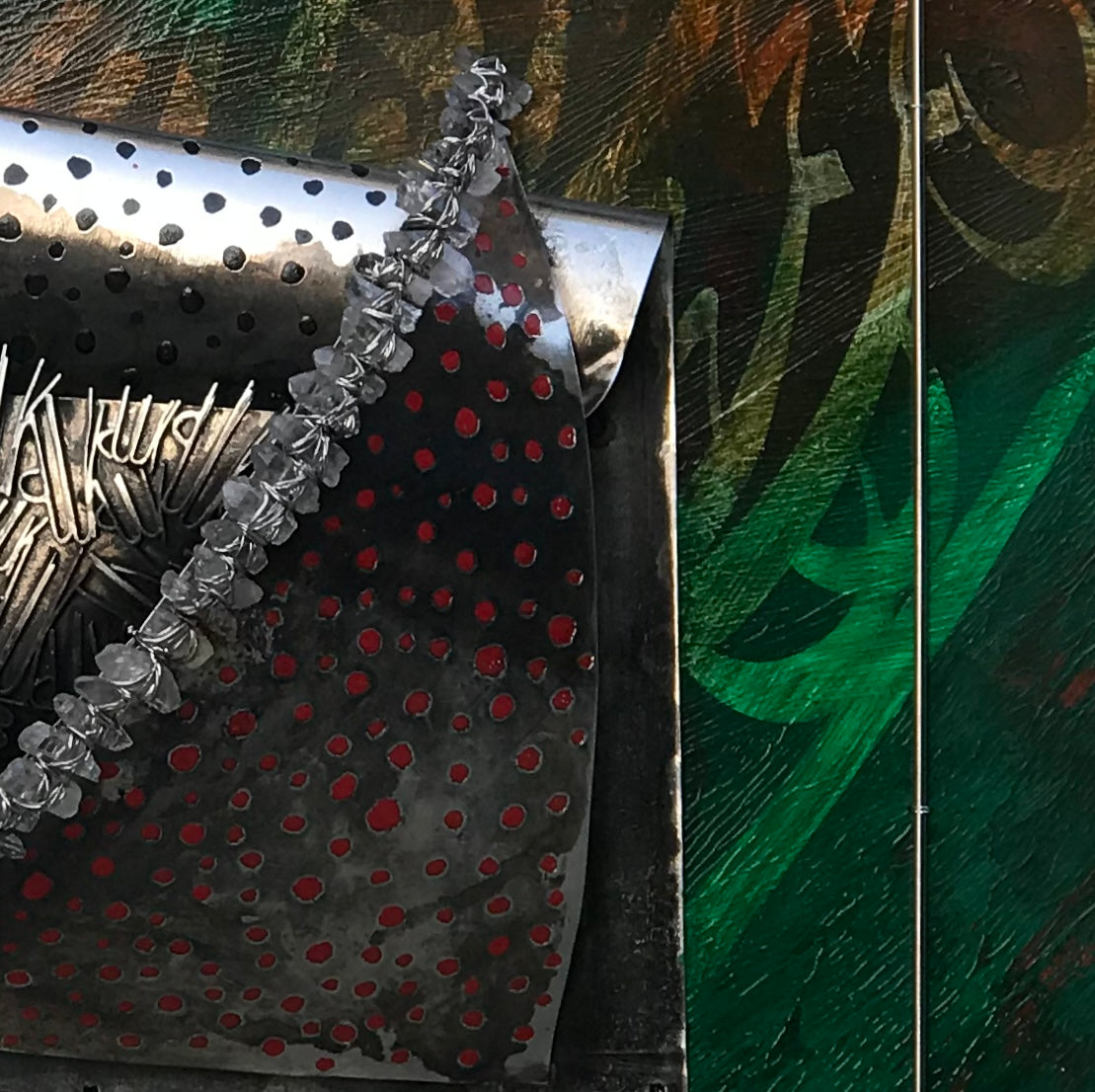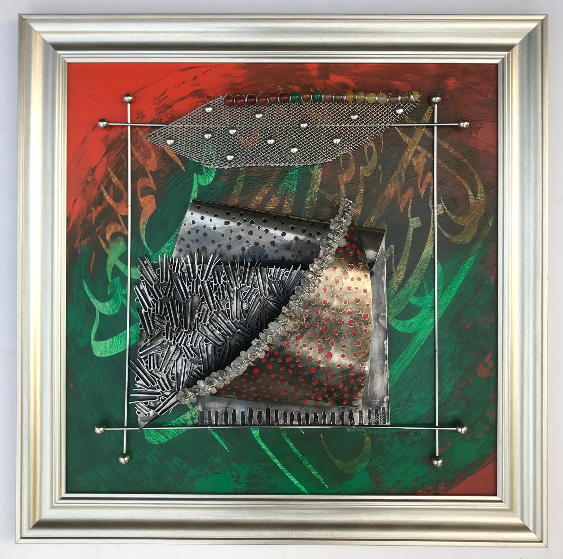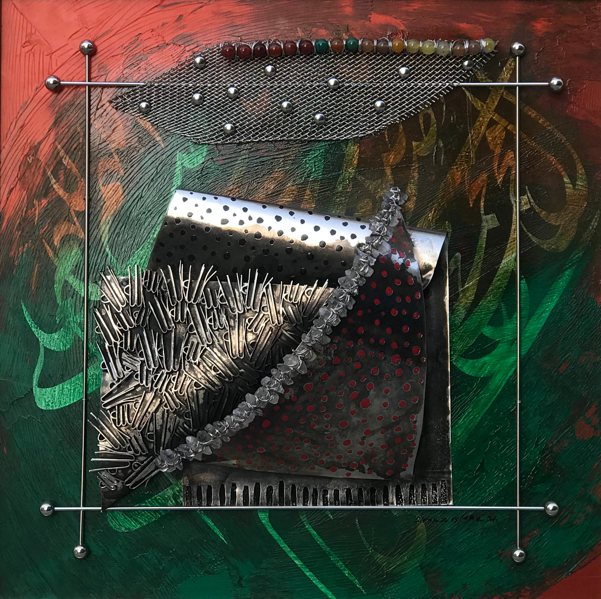 Shakil Ismail's "Durood" showcases his mastery of metalwork. A central composition, featuring the word "Allah" intricately formed from metal, takes center stage. This bold statement piece is complemented by a backdrop of elegant Nask calligraphy for "Durood Shareef," all set against a striking interplay of deep greens and oranges. Semi-precious stones add a touch of brilliance to this powerful exploration of faith and artistic expression.