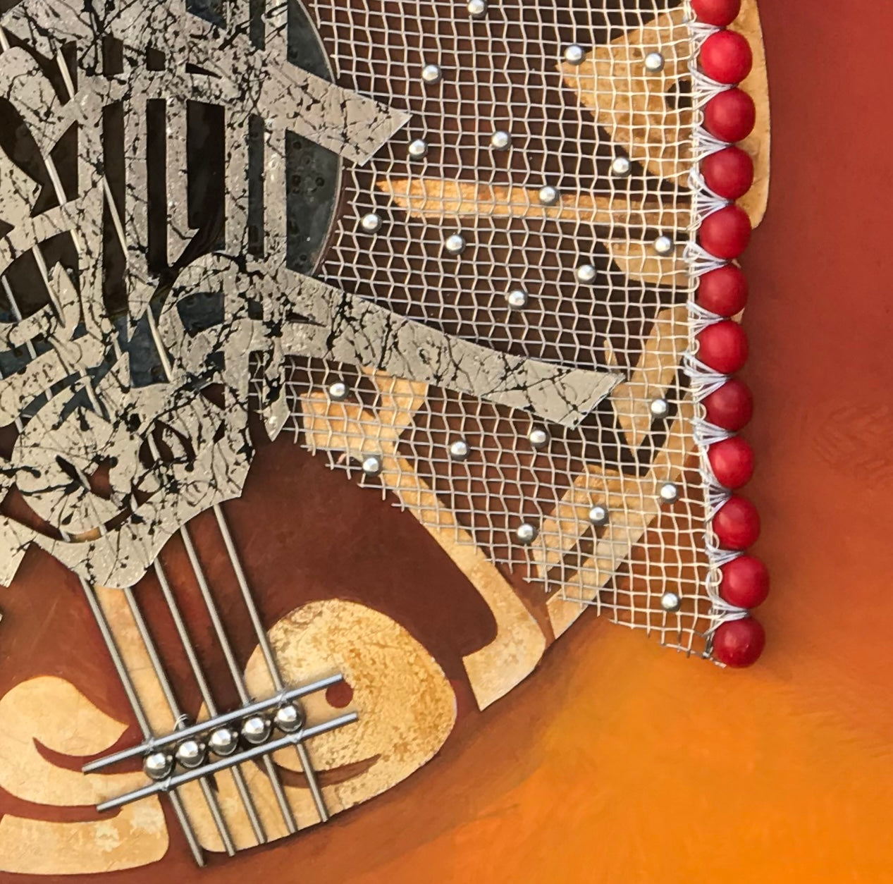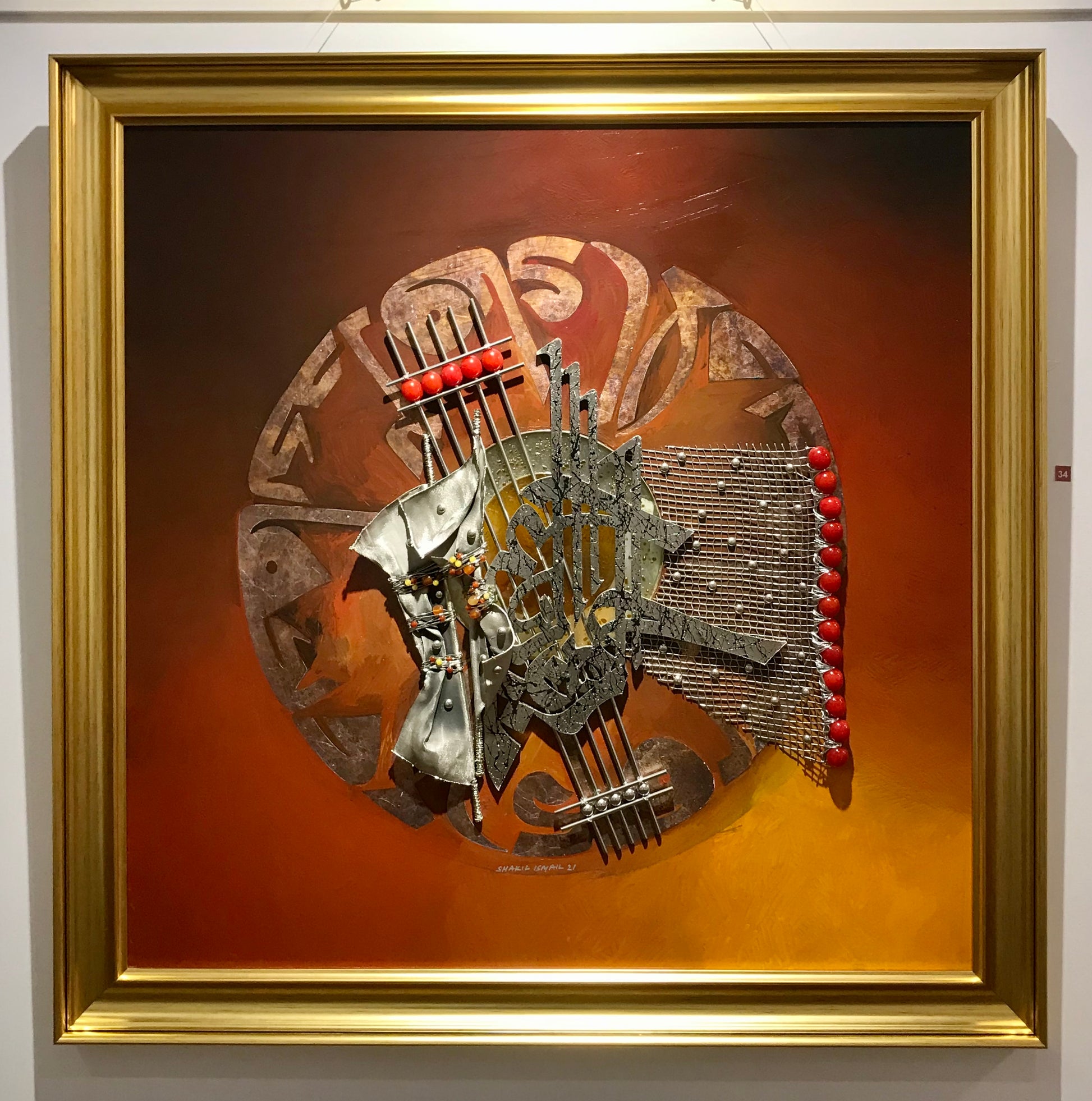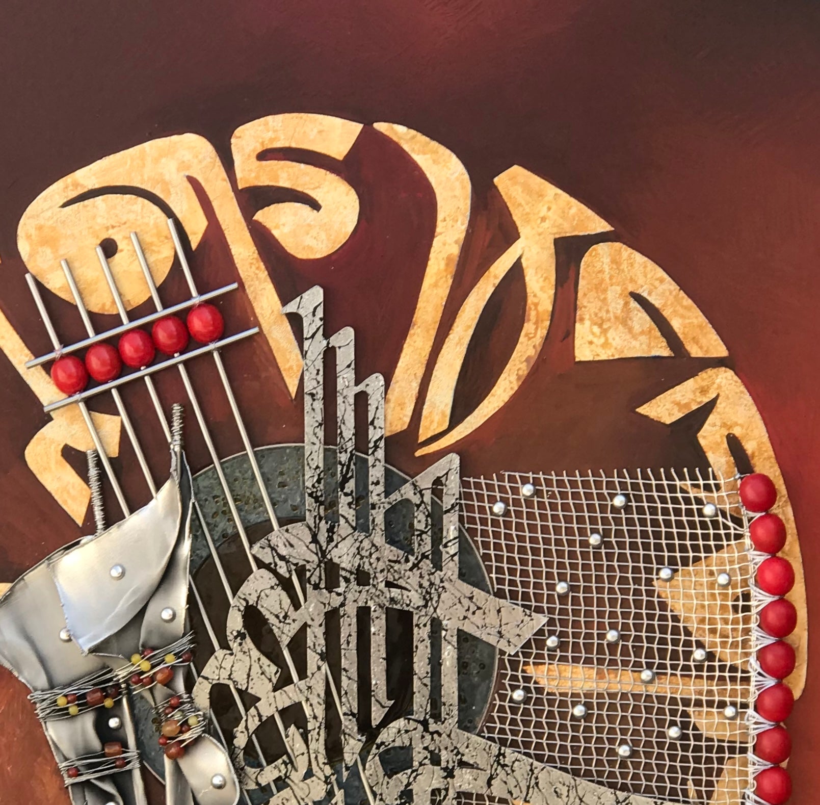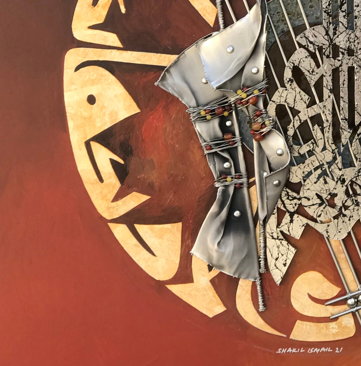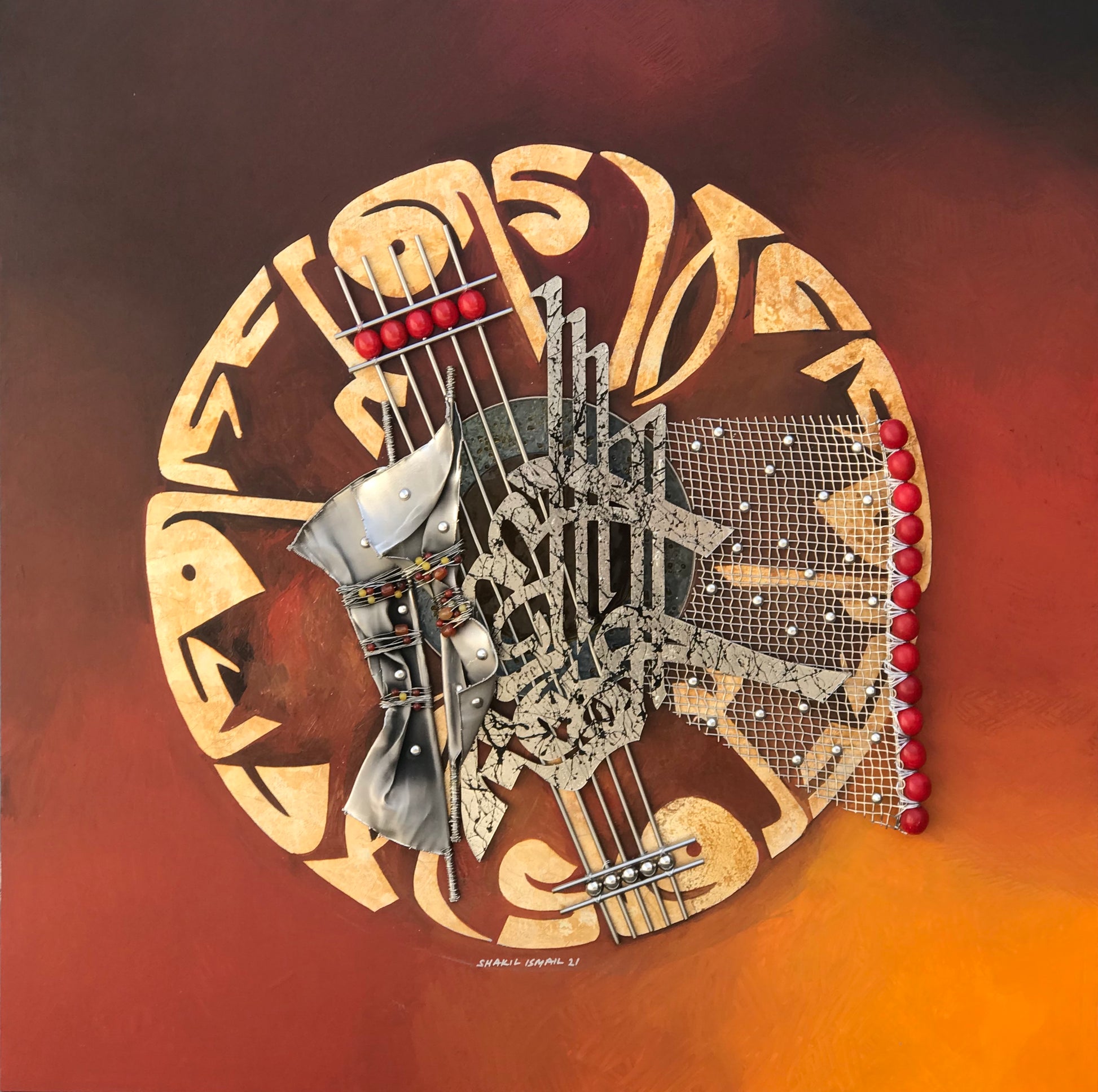 This stunning piece of Modern Art is a captivating display of dimension and texture. A silver leaf Kufic inscription of "Fabi Ayyi Ala I Rabbikuma Tukazziba" forms a striking background for a central circular glass piece. In the foreground, a dynamic, three-dimensional metal calligraphy of "Ar Rehman Ar Rahim" in Shakil's own style takes center stage, surrounded by captivating metalwork and adorned with semi-precious stones. A rich brown palette unifies this modern masterpiece.