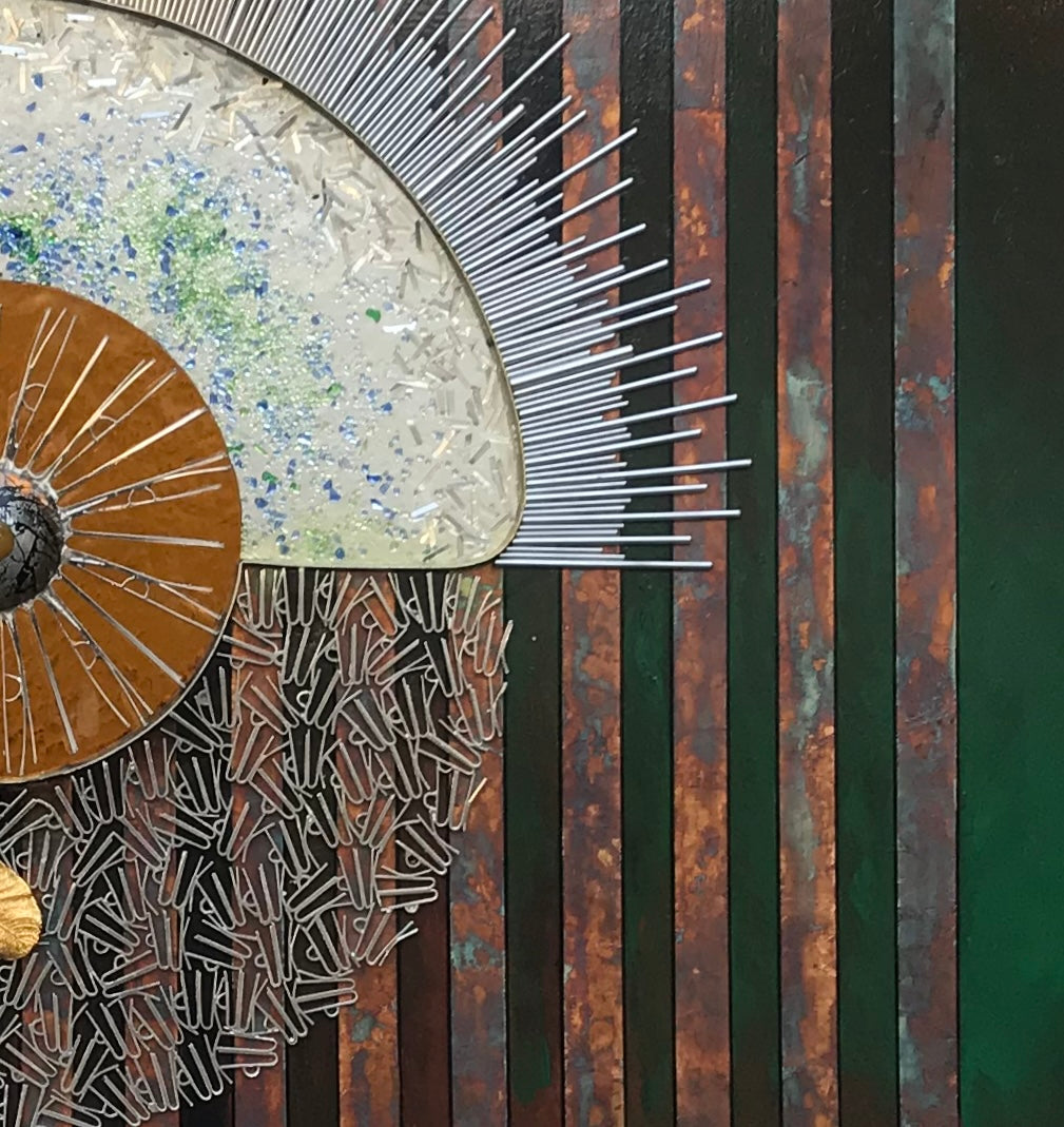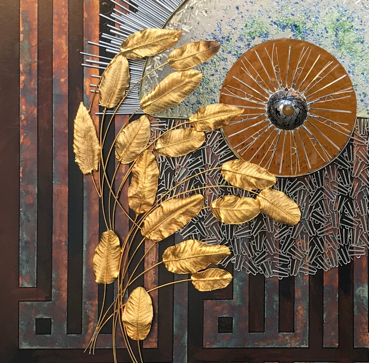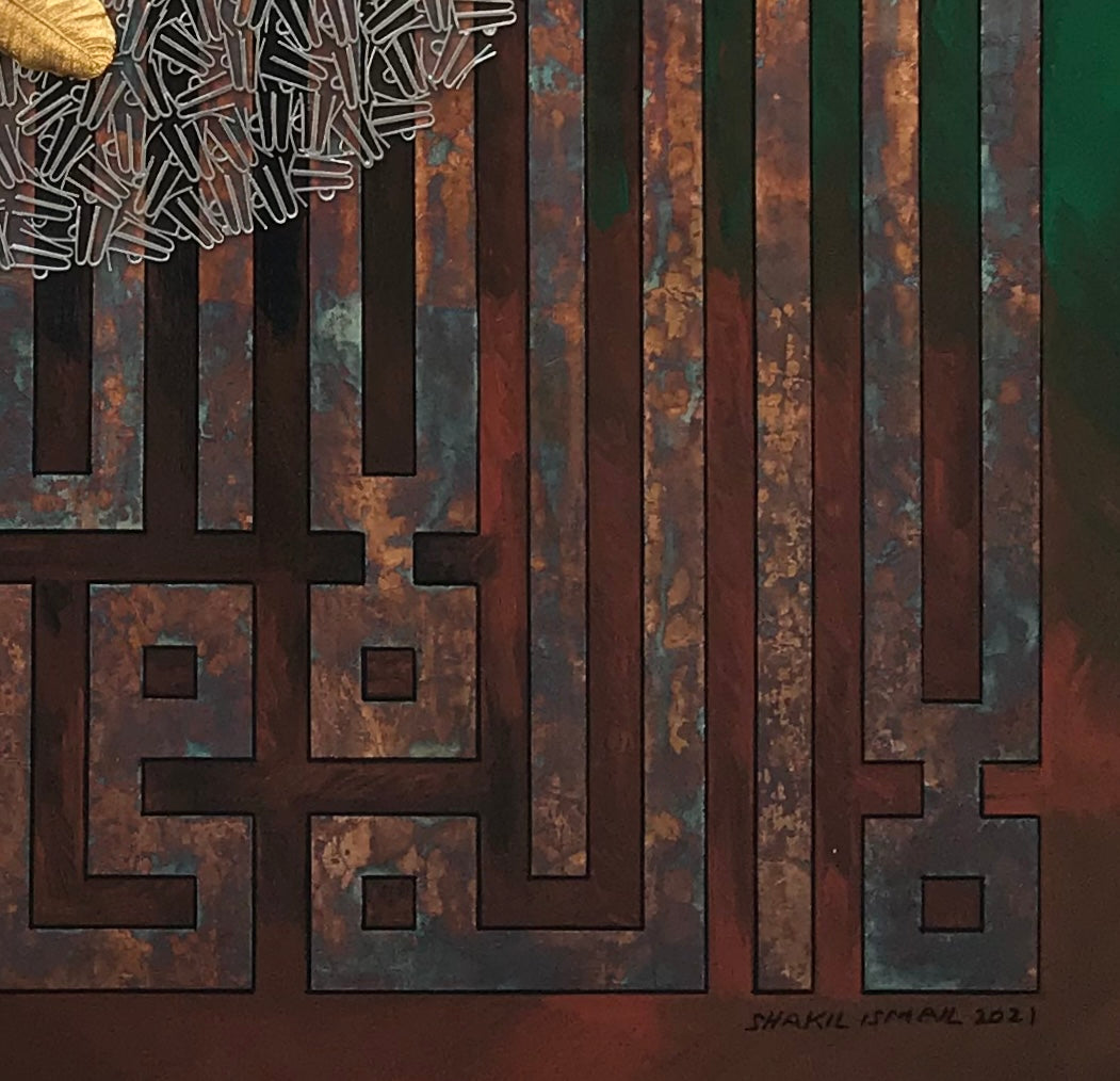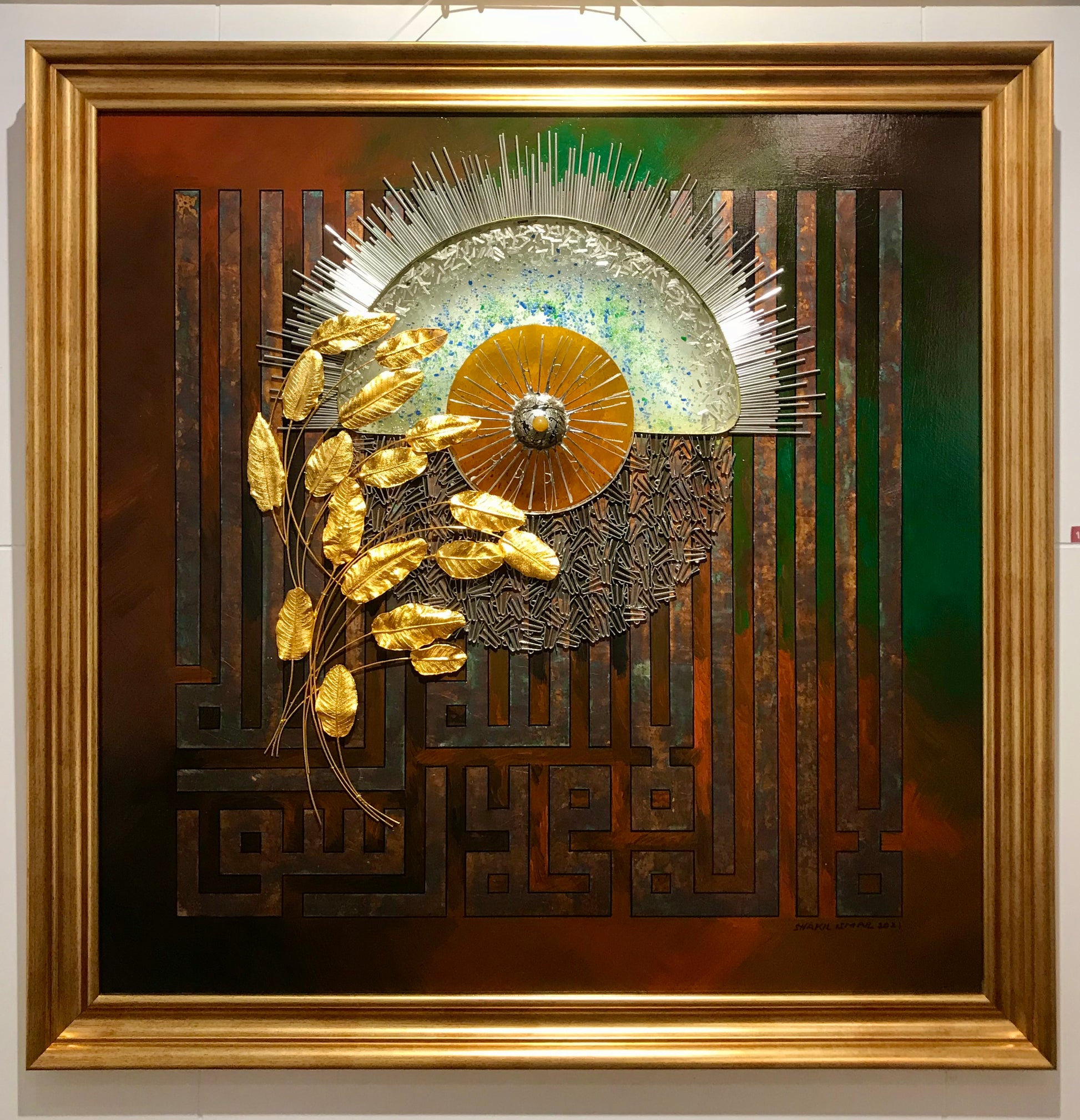 Enhance your home decor with this modern art calligraphy masterpiece. Artistically crafted with an assortment of Metal and Glass casting combined with the gold plated leafs and silver leafing on the calligraphy, this stunning piece is sure to make a lasting impression. Created by Shakil Ismail, it reads "La ilaha illallah Muhammadur Rasulullah" - an Islamic phrase meaning "there is no deity but God and Muhammad is the messenger of God".