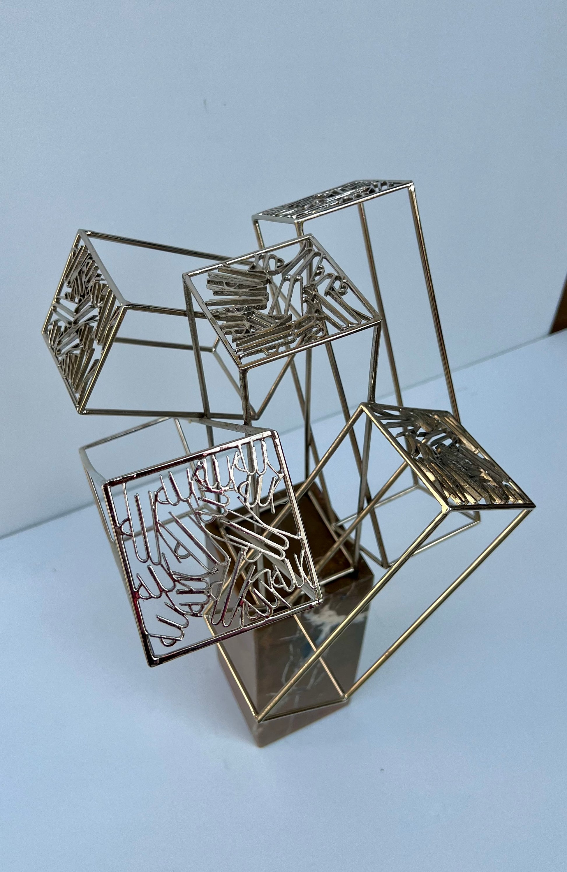 Perched upon a sleek marble base, the Cuboid Ensemble Sculpture stands as a testament to Shakil Ismail's ability to transform raw materials into a masterpiece that resonates with both aesthetic beauty and profound spirituality. Invite this exceptional work of art into your space and experience the harmonious convergence of contemporary design and timeless devotion.
