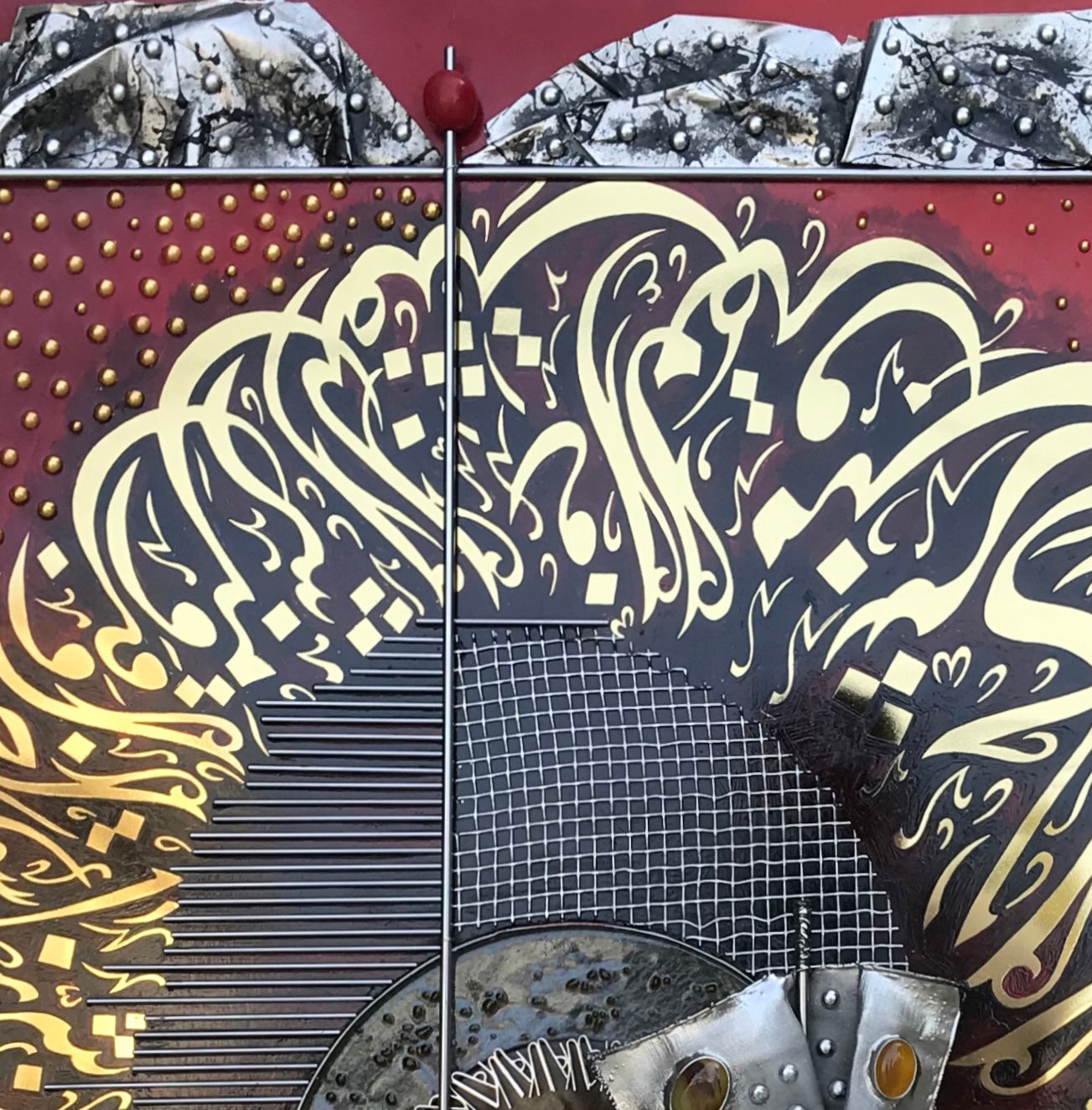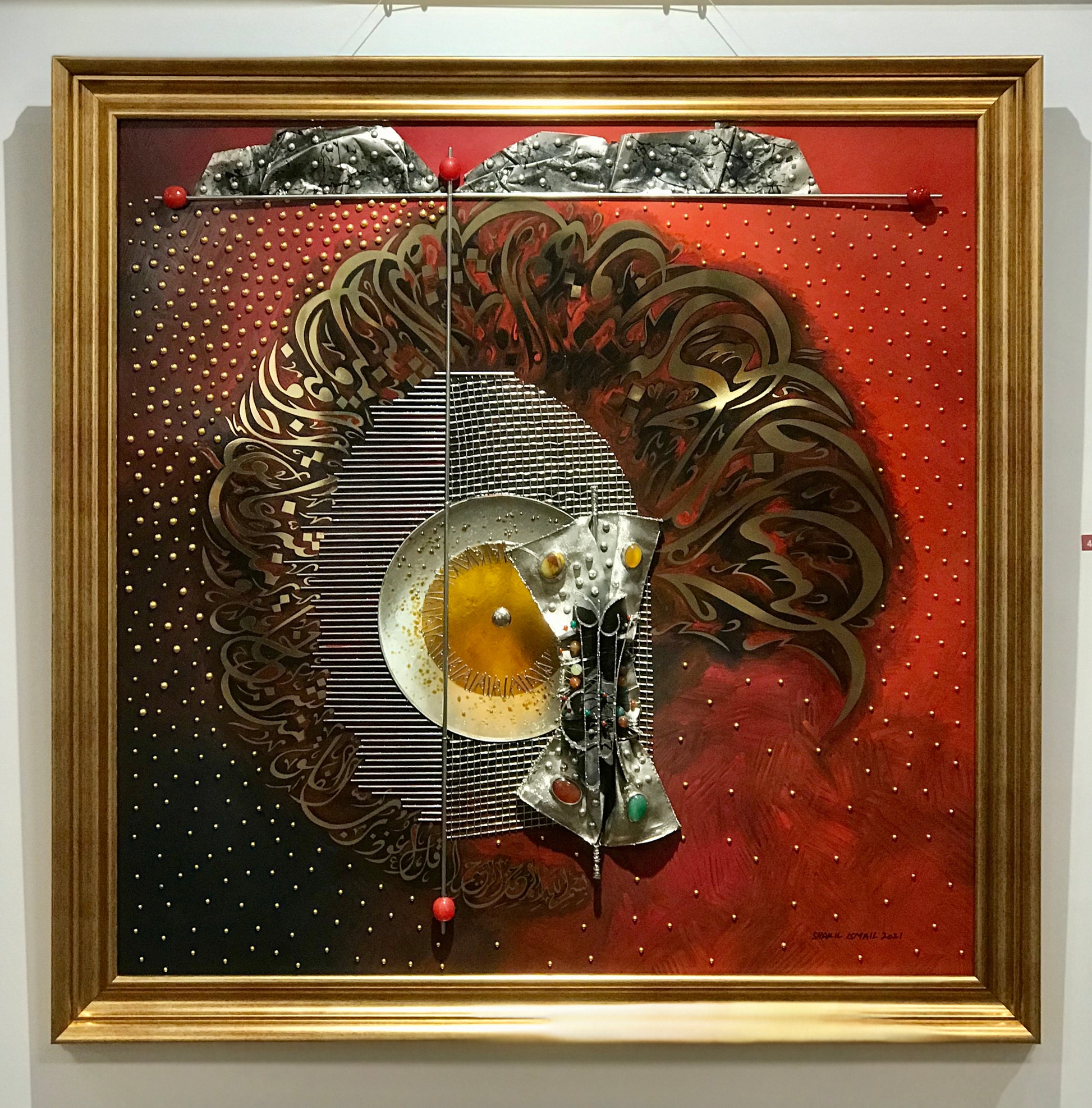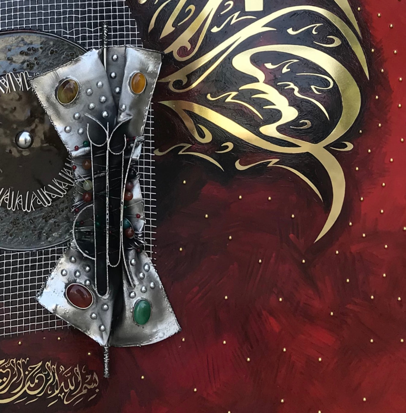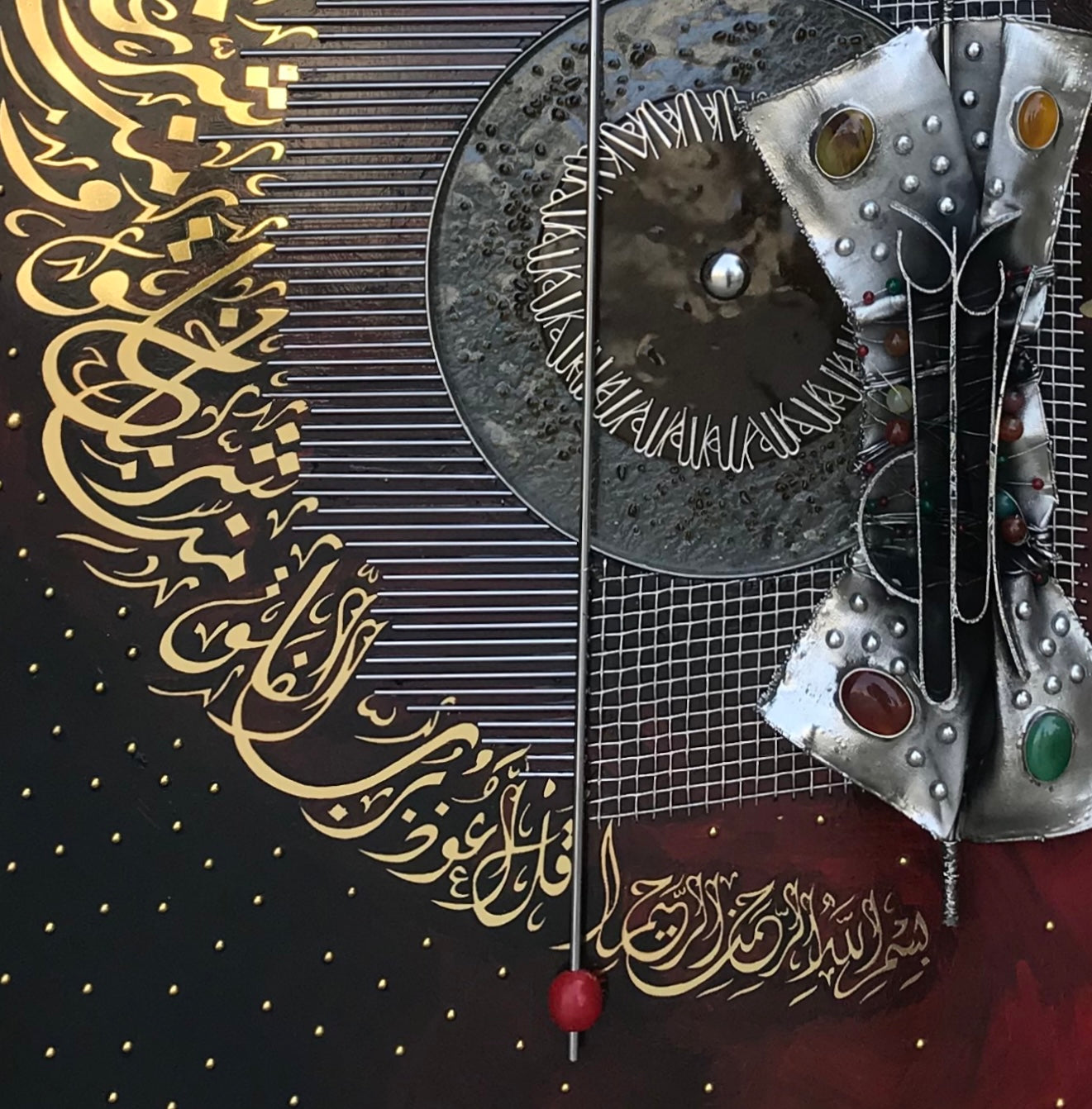 Shakil Ismail's "Surah Al Falak" is a mesmerizing exploration of faith and form. A captivating Deewani calligraphy of the Surah Al Falak begins small, elegantly growing and curving to form an almost-circle, all rendered in gleaming gold. A central casted glass disc and a surrounding metal calligraphy "Allah" inscription add depth, while a foreground metal composition with semi-precious stones completes this visually striking and unique modern masterpiece. Rich reds unify the artwork, creating a powerful statement.