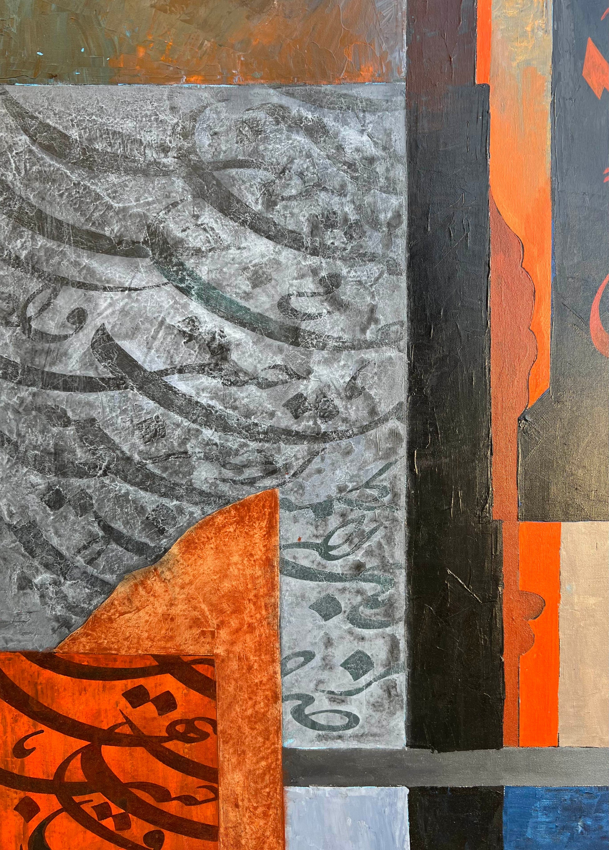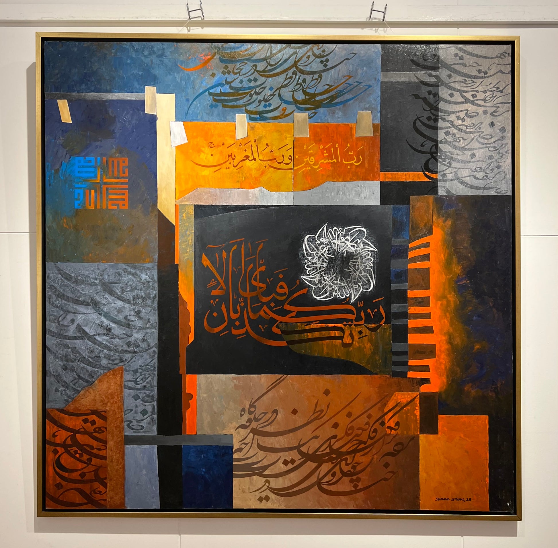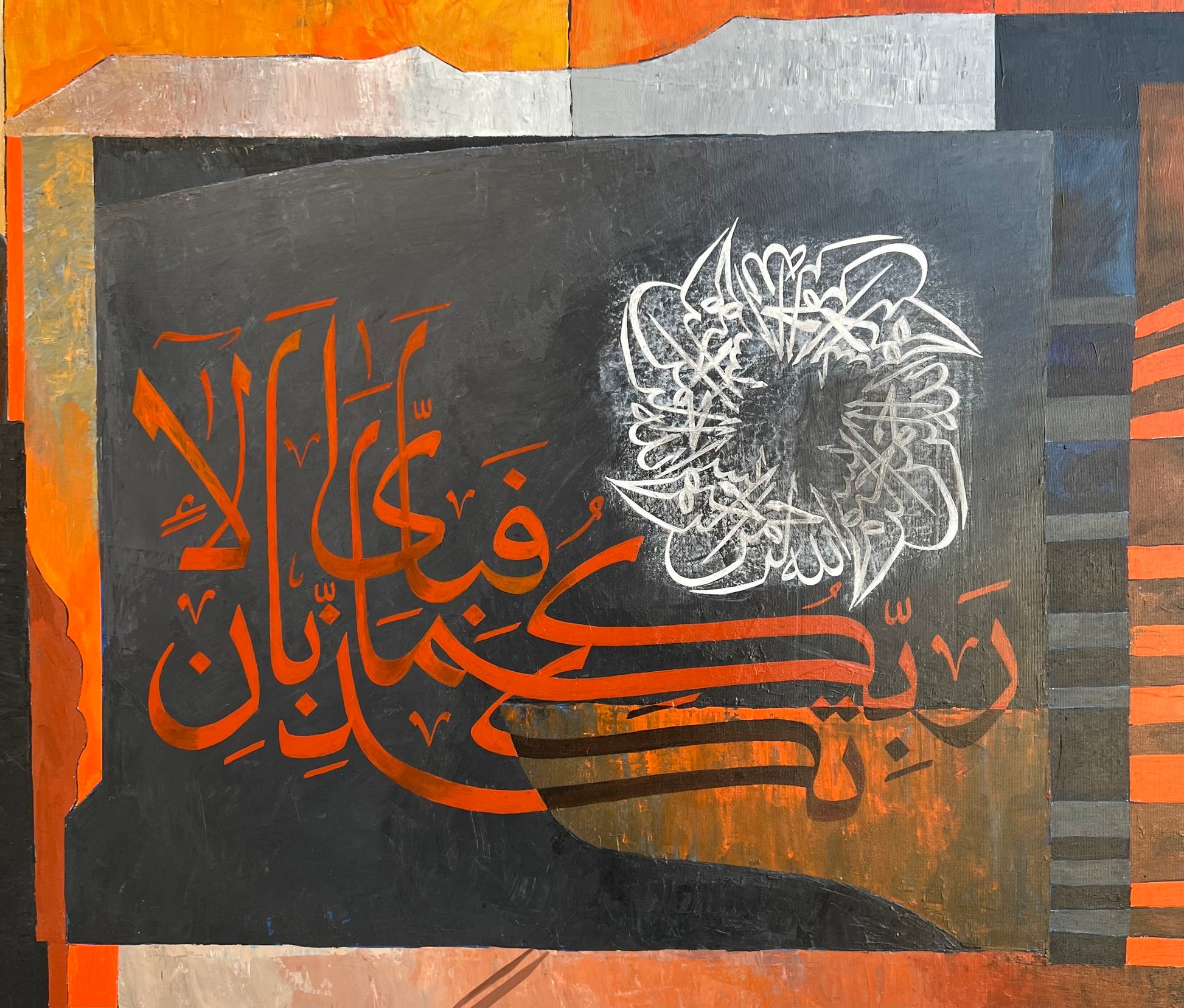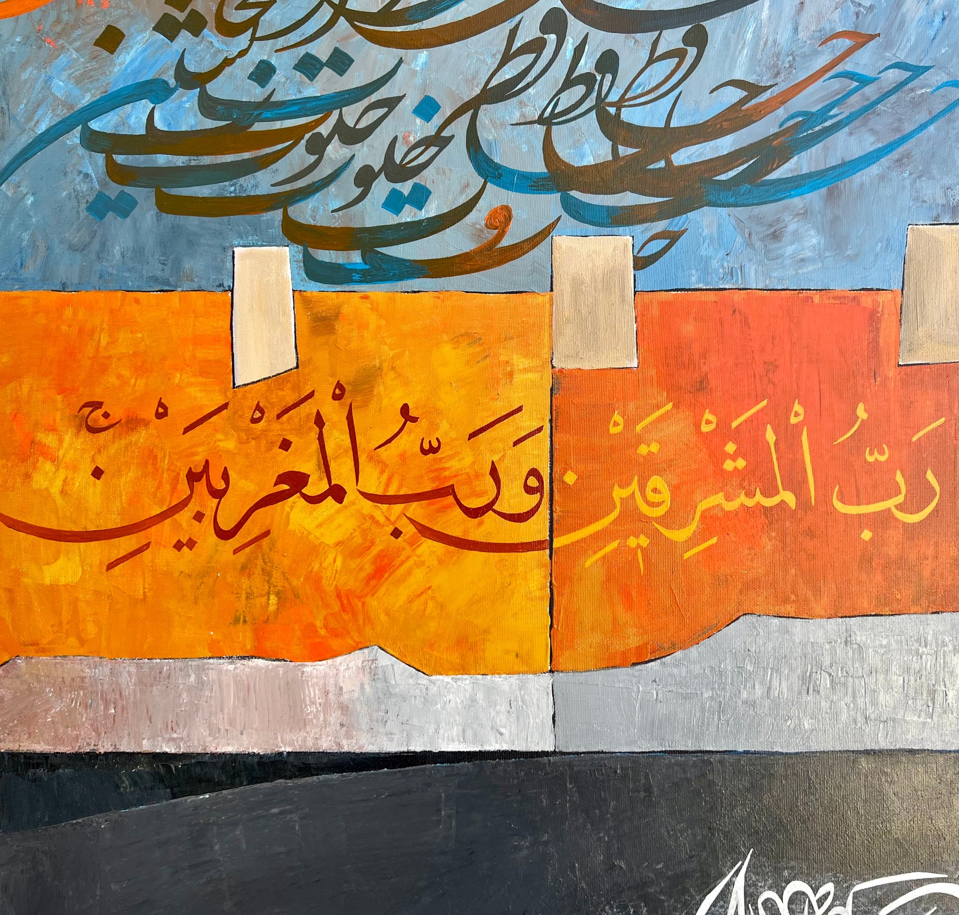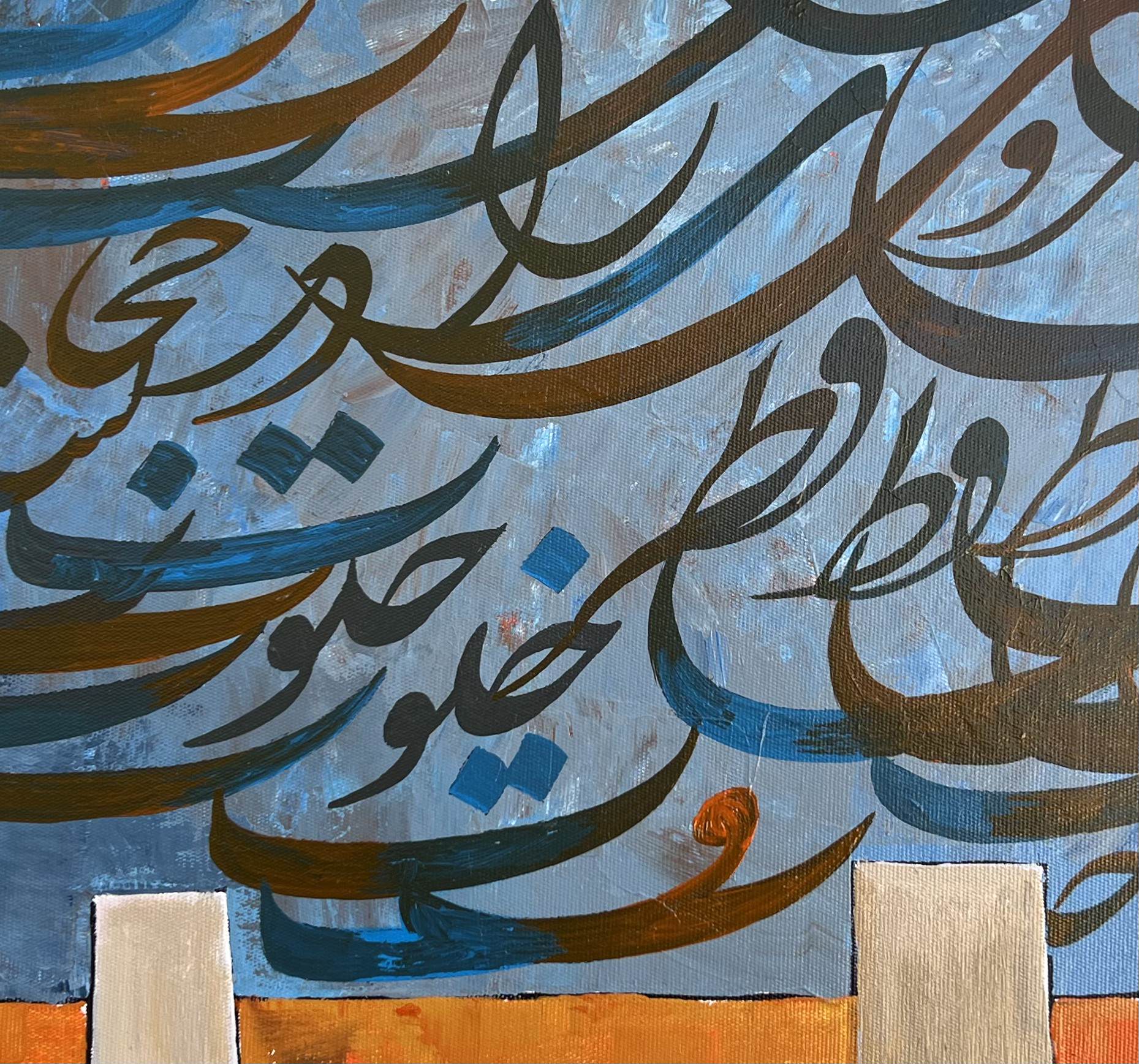 Measuring 60 x 60 inches, this artwork commands attention with its blend of script and color. "Surah Rehman" is an exploration of faith and artistry that enriches any space.