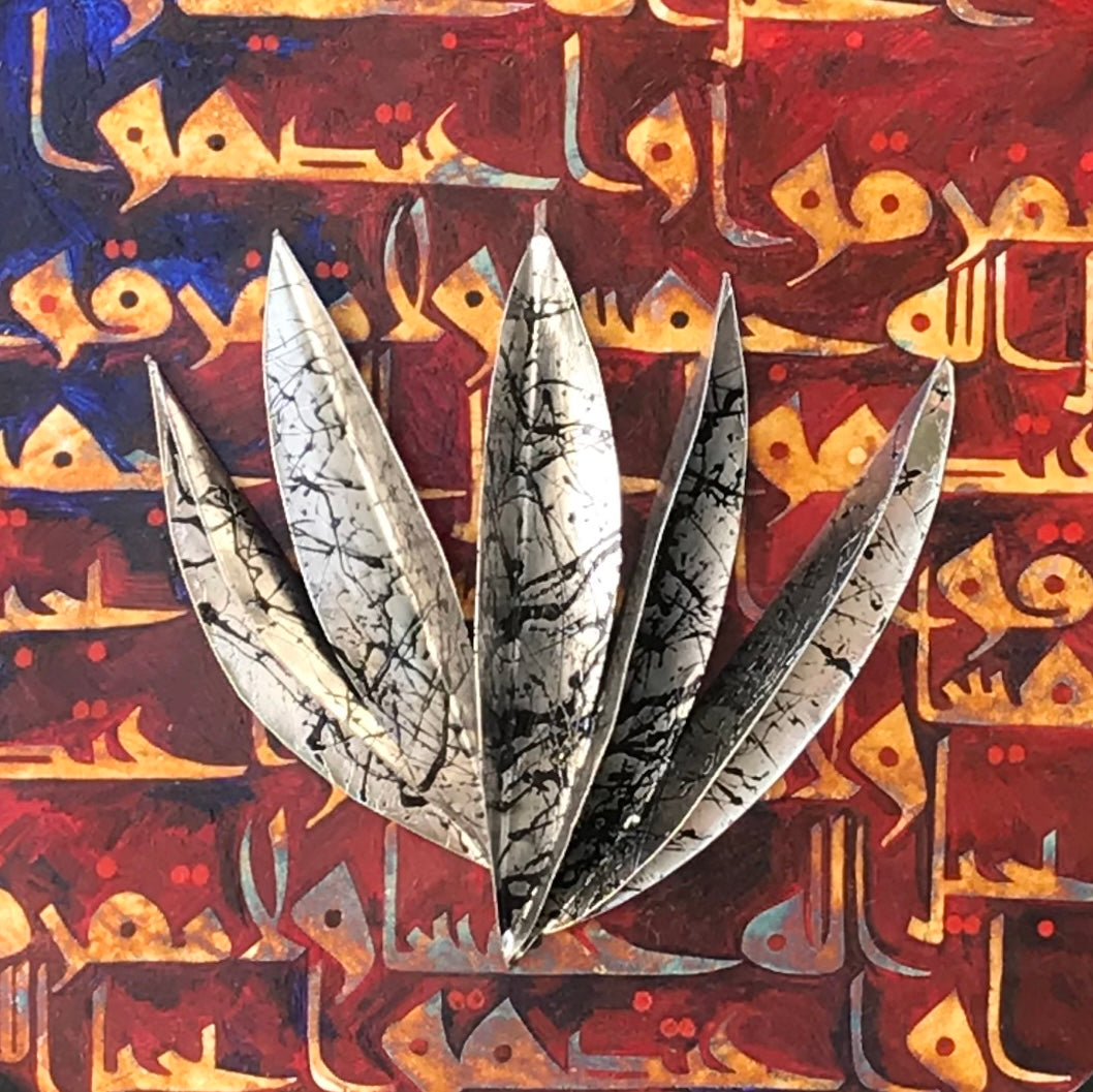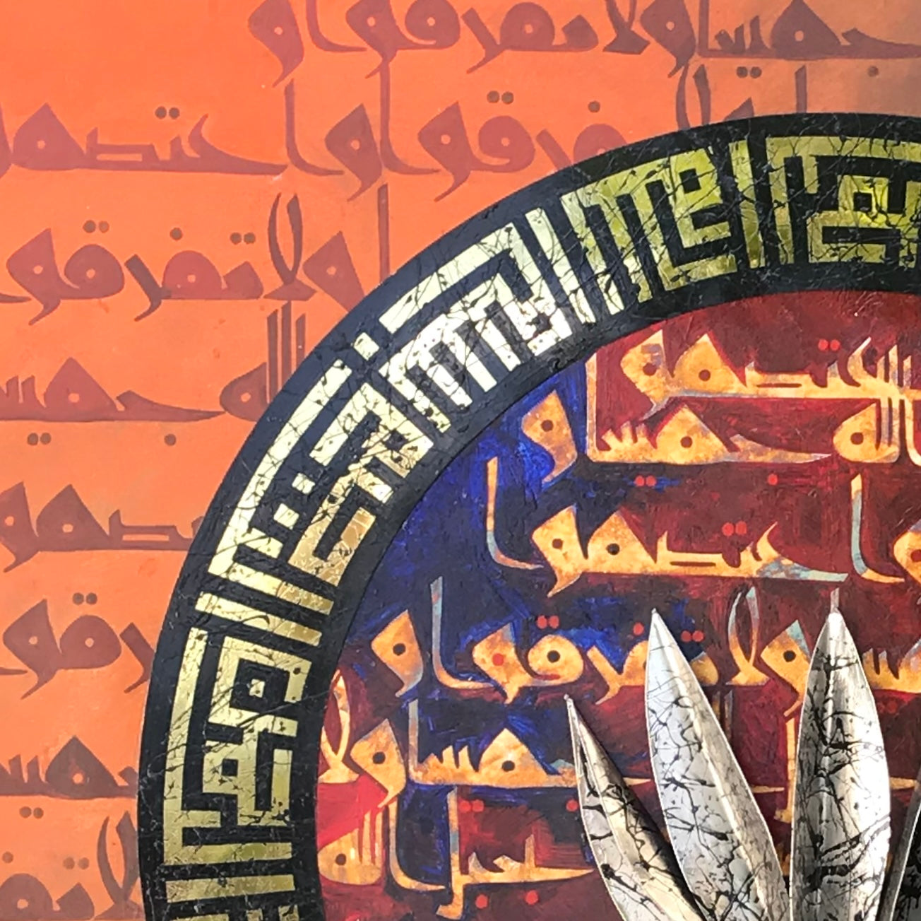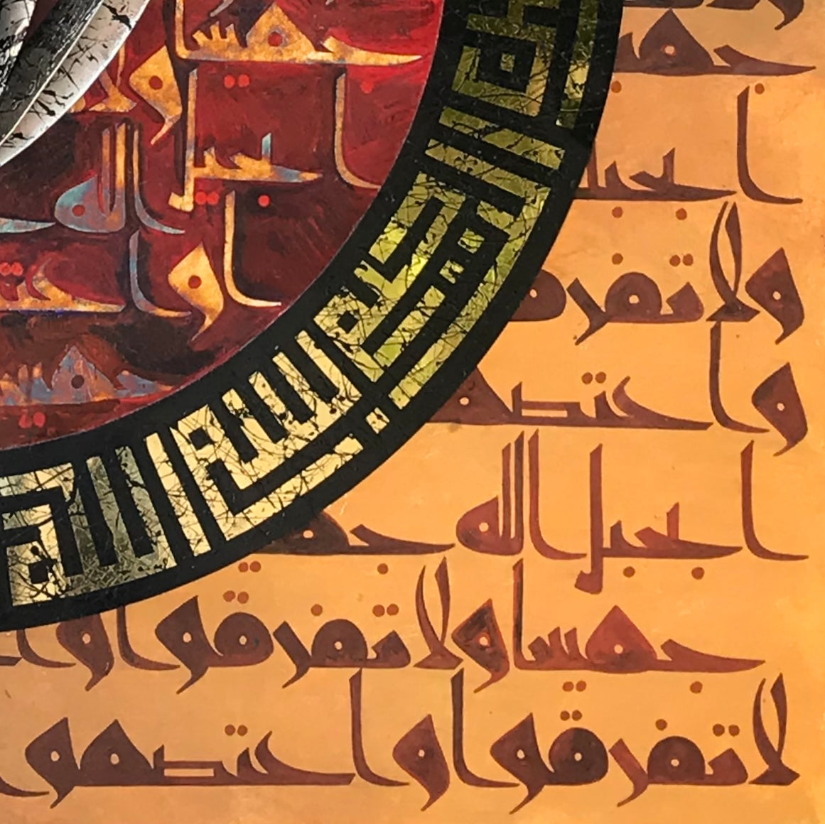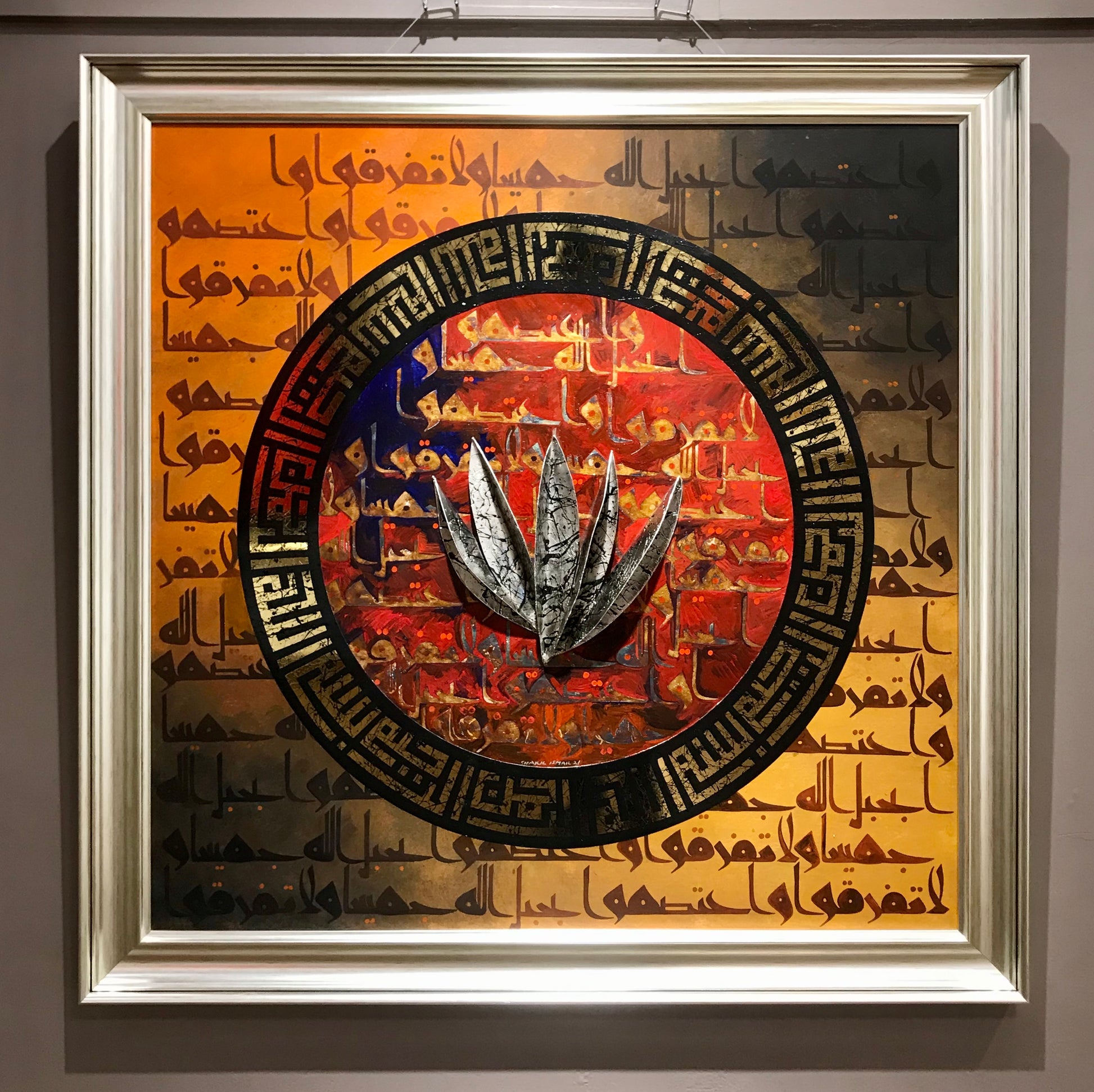 A calligraphic masterpiece by Shakil Ismail, this unnamed artwork pulsates with the power of the written word. At its heart, a bold metal "Allah" inscription takes center stage. A radiant halo of gold surrounds it, bearing the inscription "Bismillah ir Rehman ir Rahim" in a mesmerizing geometrical Kufic script. Finally, the powerful message of unity, "Wa 'tasimu Bihablillahi Jamia Wala Tafarraqu," echoes both within and outside the circle, rendered in elegant silver leaf. This modern masterpiece is a testament to the beauty and strength of Islamic calligraphy.